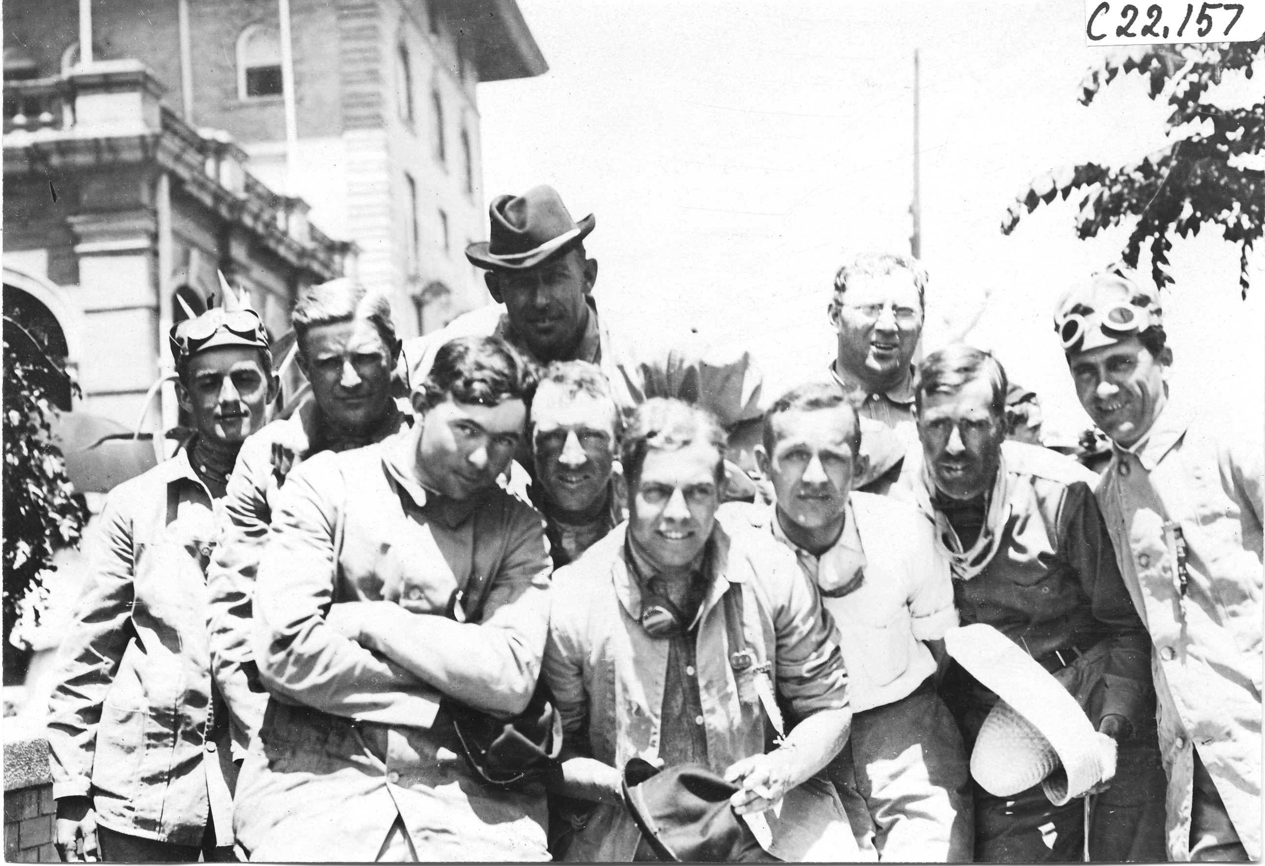 4.5x6.5 black and white photograph of Pierce-Arrow driving team, ten participants in driving clothes posing for the camera in front of the Antlers Hotel, in Colorado Springs, Colorado, at the 1909 Glidden Tour. Negative #C22,157.