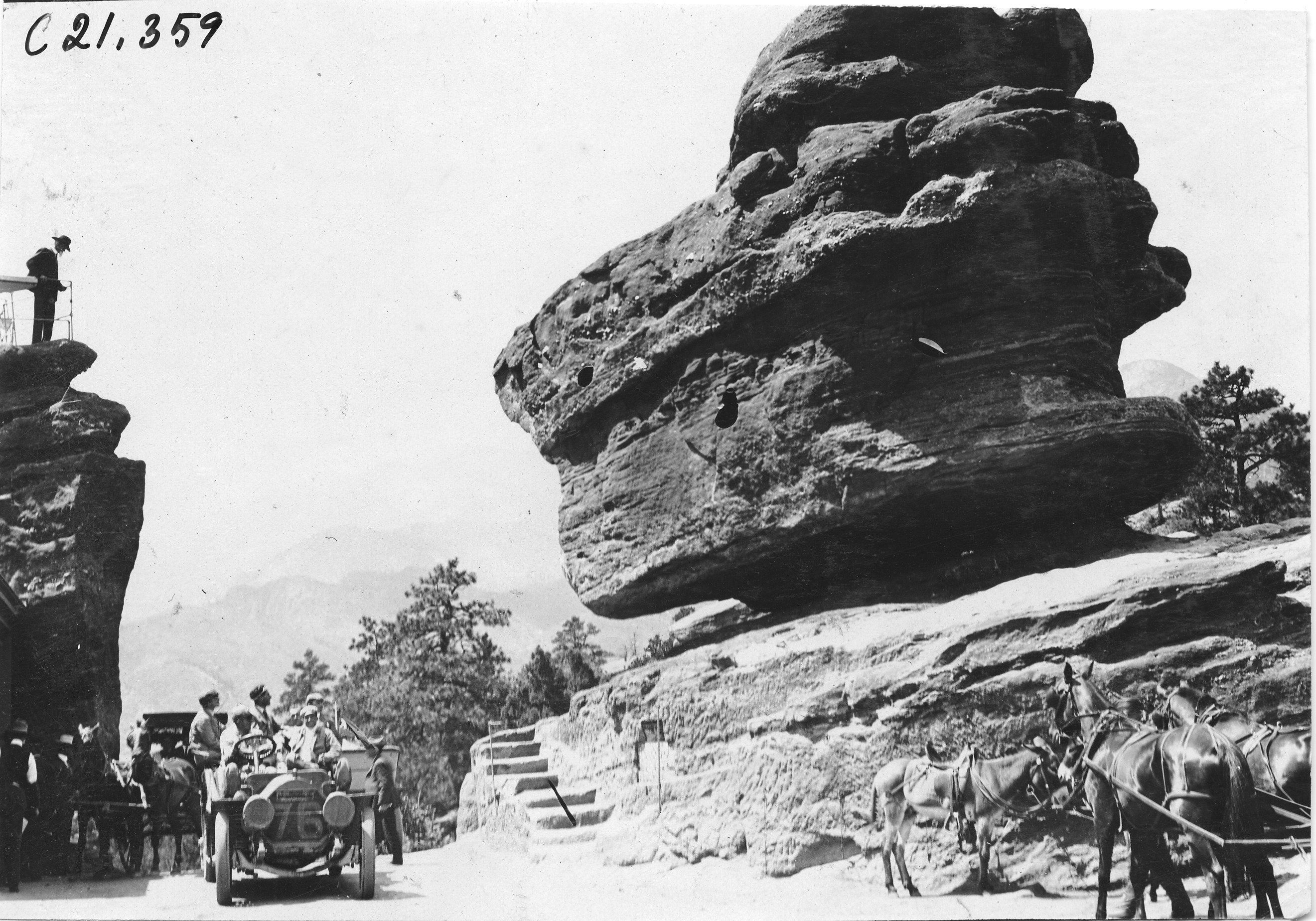 4.5x6.75 black and white photograph of Chalmers car #76 with driver and four passengers next to Balanced Rock, horse and buggy in background, man atop lookout across from rock, in the Garden of the Gods at Colorado Springs, at the 1909 Glidden Tour. Negative #C21,359. Photo edges cut unevenly.