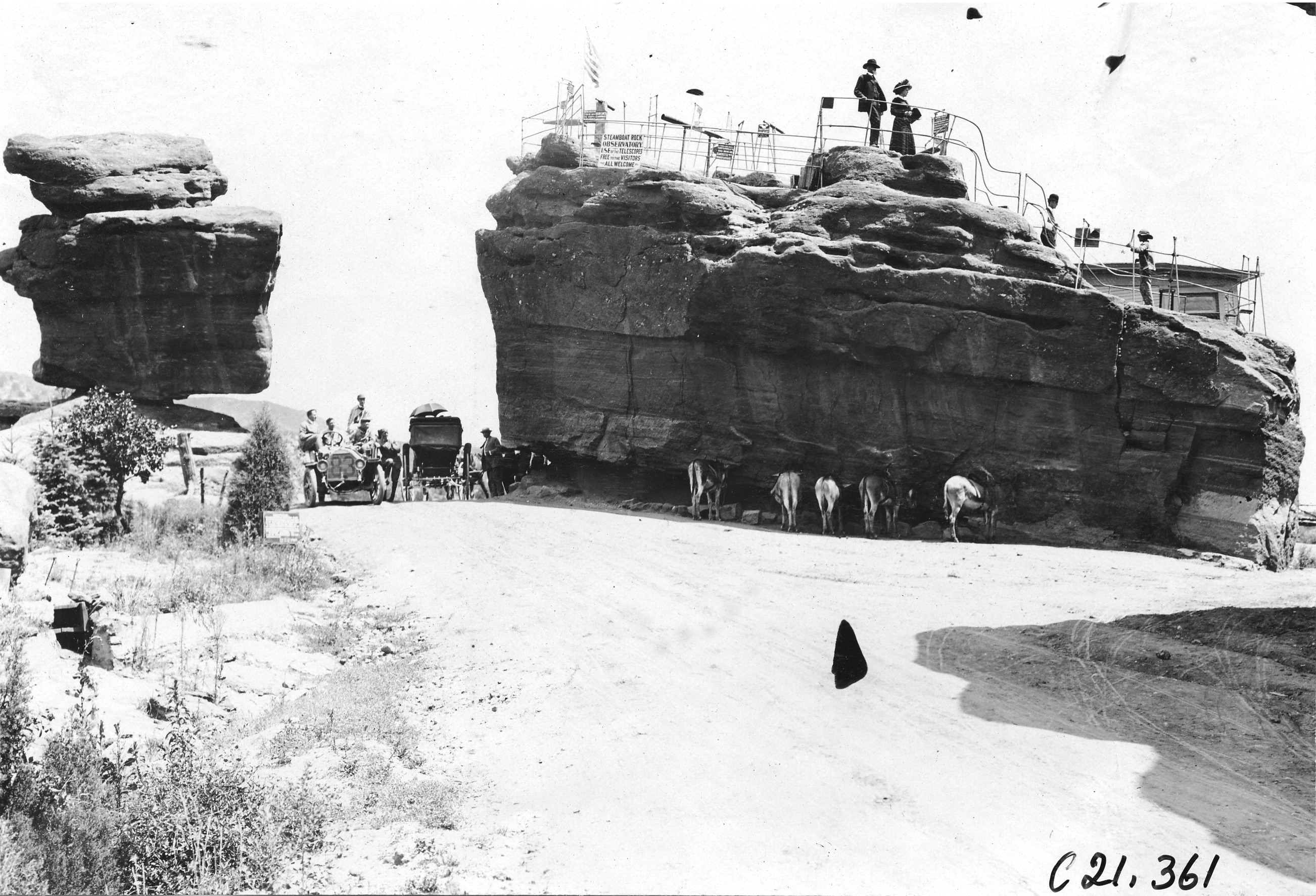 Glidden tourists at Balanced Rock in the Garden of the Gods, Colo., at the 1909 Glidden Tour