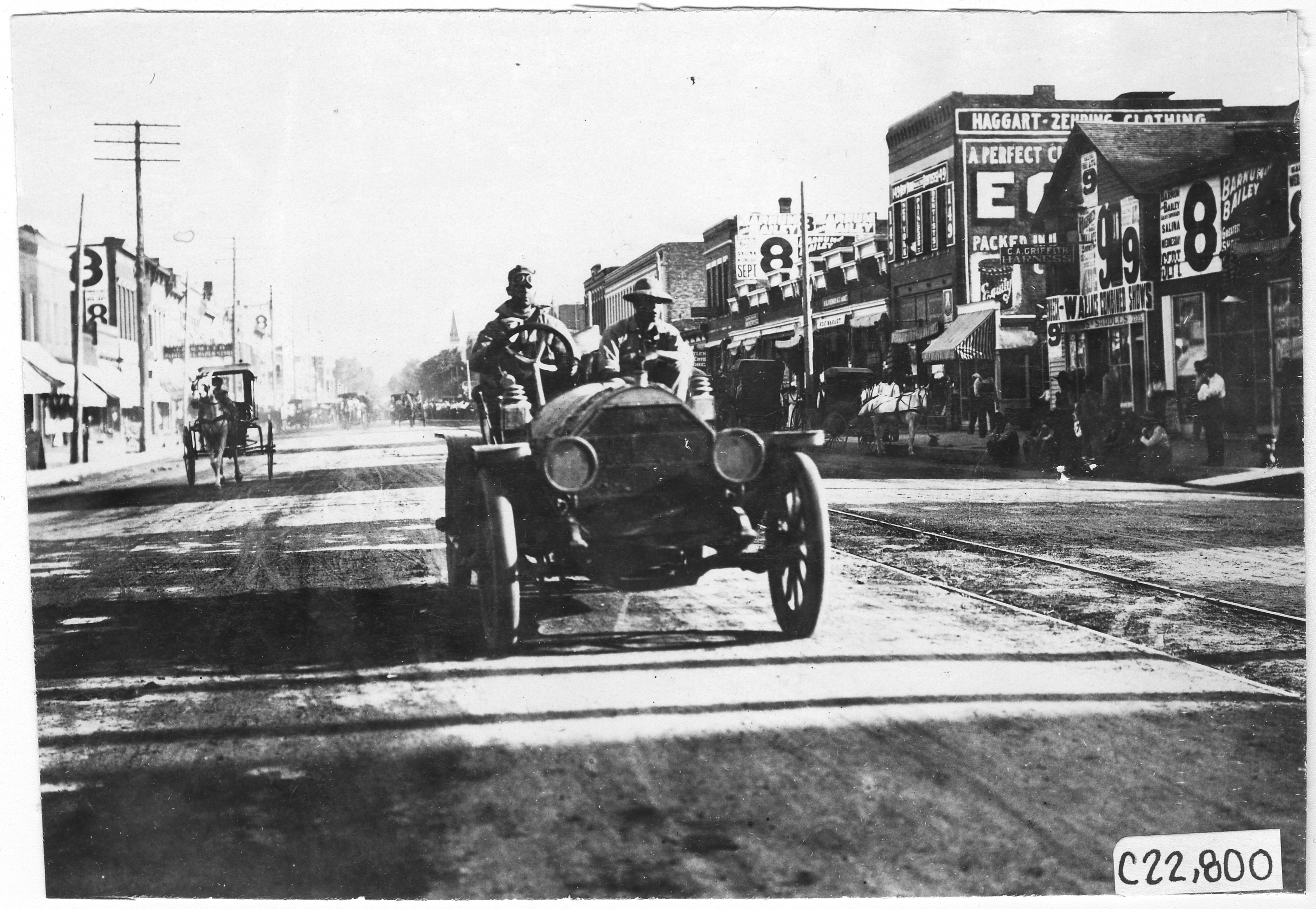 4.5x6.5 black and white photograph of car with driver and passenger, passing through downtown Hugo, Colorado, horse and buggy in the background, at the 1909 Glidden Tour. Negative #C22,800. Photo edges cut unevenly.
