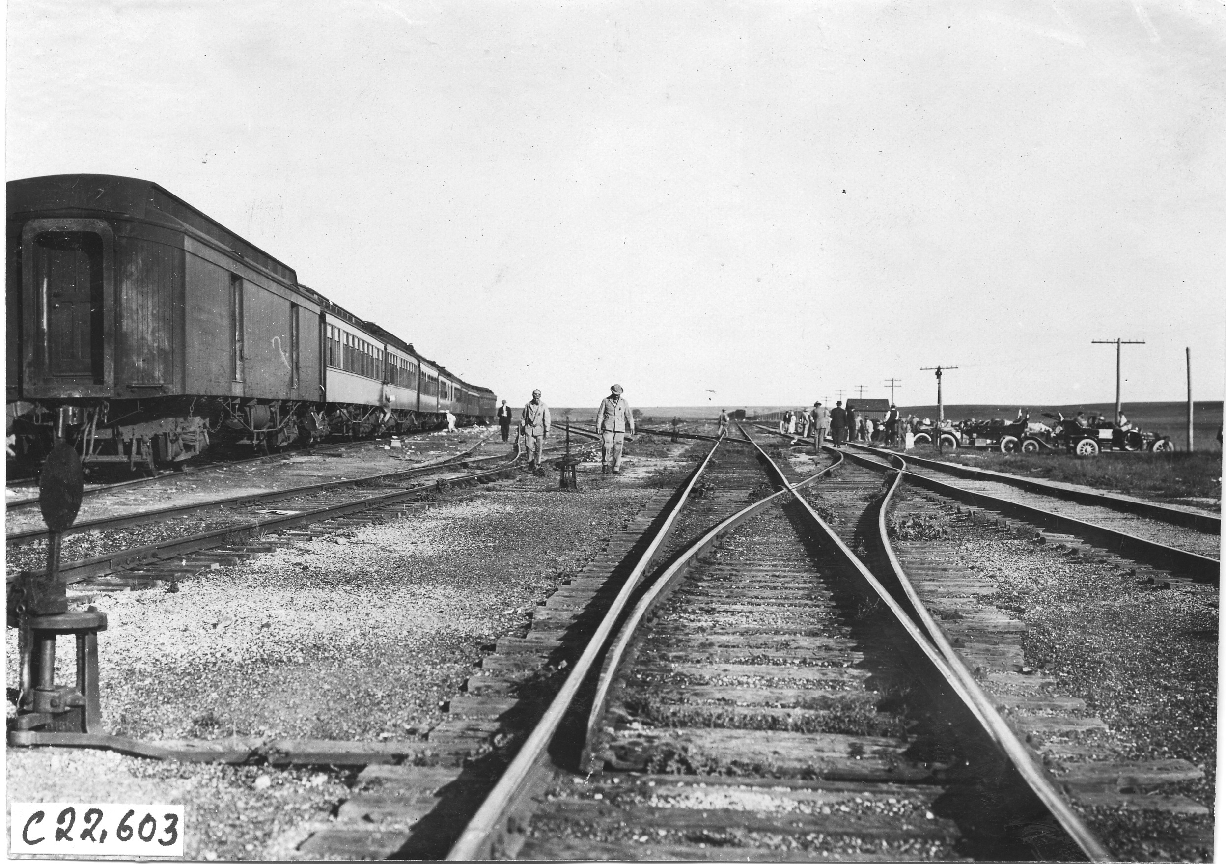 4.5x6.25 black and white photograph of railroad tracks, passenger train stopped, several Glidden tourists walking along tracks, cars stopped at crossing, at the 1909 Glidden Tour. Negative #C22,603. Photo edges cut unevenly.
