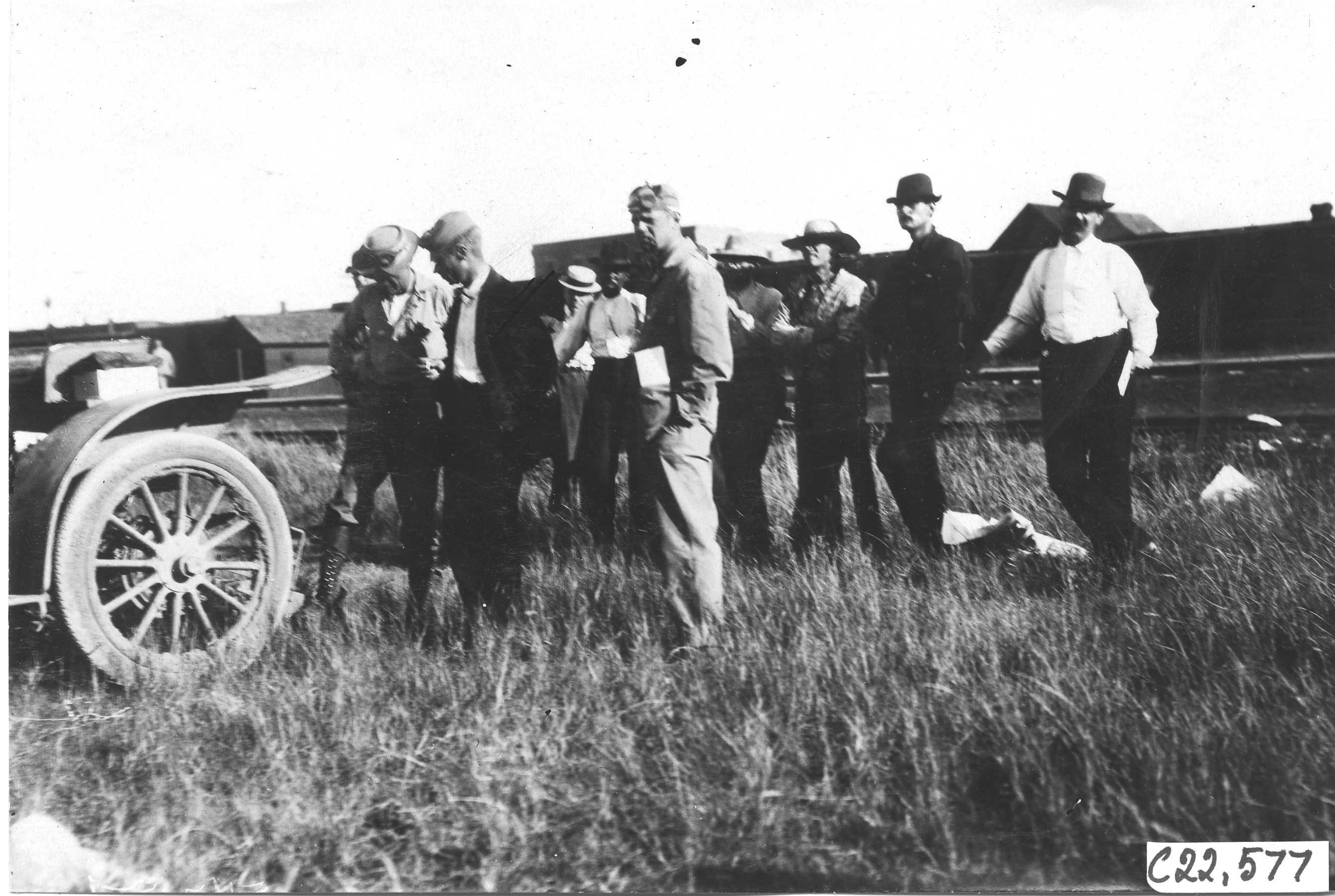 4.5x6.75 black and white photograph of Glidden participants standing around rear of car, in grassy field, local onlookers. Caption on photo back: 'Mr. Marmon thinks things over,' at the 1909 Glidden Tour. Negative #C22,577.