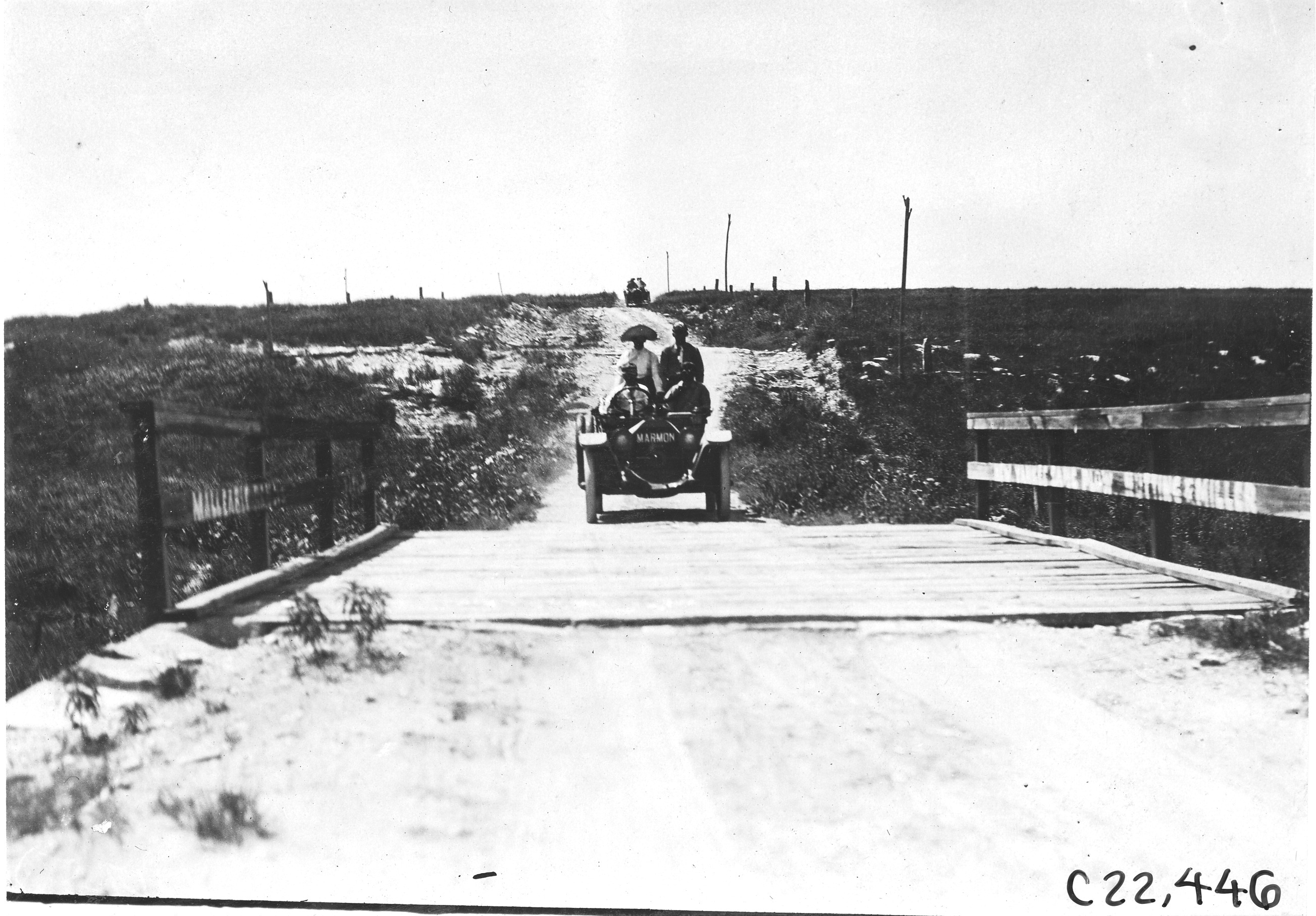 4.5x6.5 black and white photograph of Marmon #5 with driver and three passengers approaching wooden bridge, near Bunker Hill, Kansas, at the 1909 Glidden Tour. Negative #C22,446.