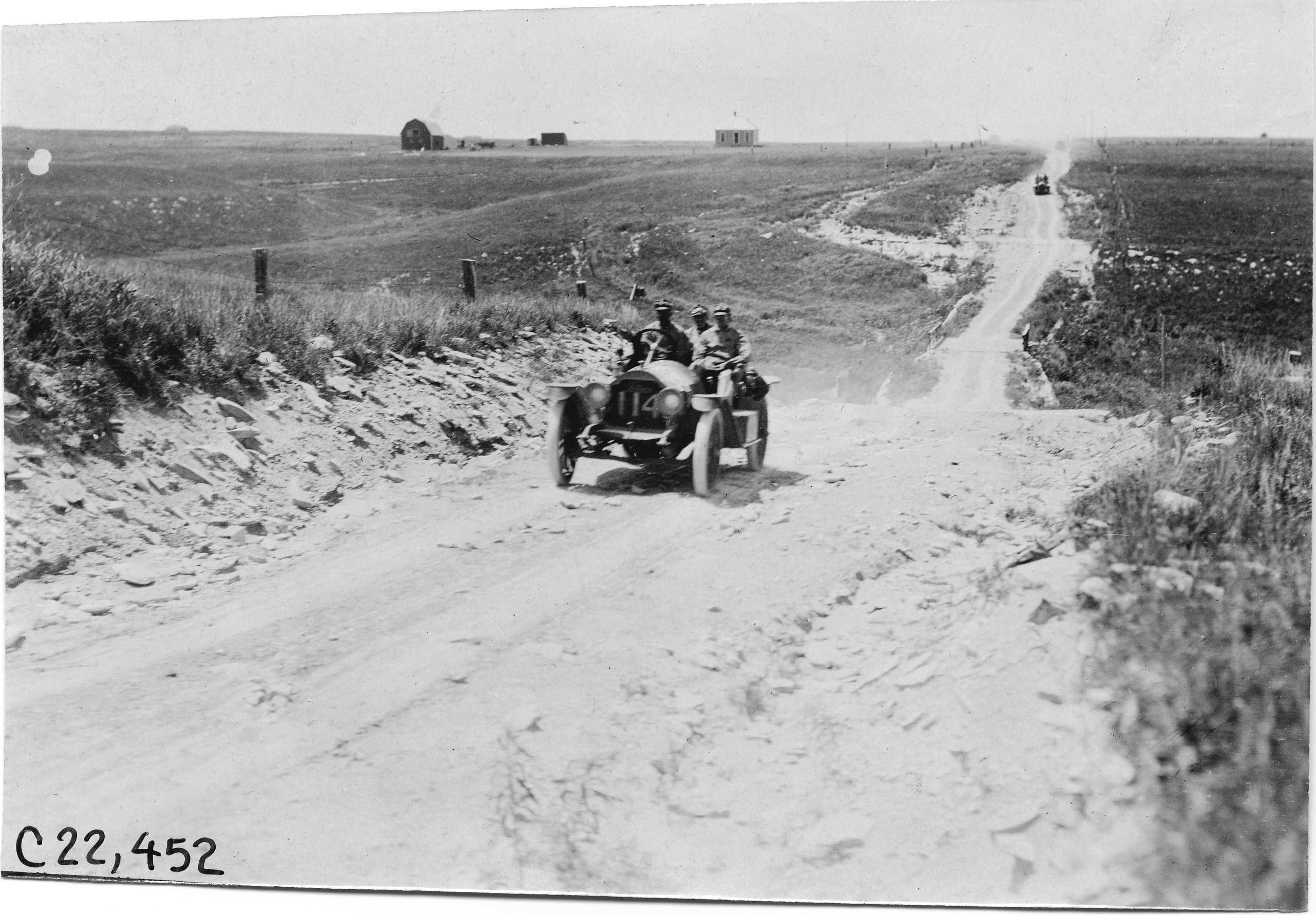 4.5x6.25 black and white photograph of Lexington #114 with Moore and two passengers climbing Bunker Hill in Kansas, at the 1909 Glidden Tour. Negative #C22,452. Photo edges cut unevenly.