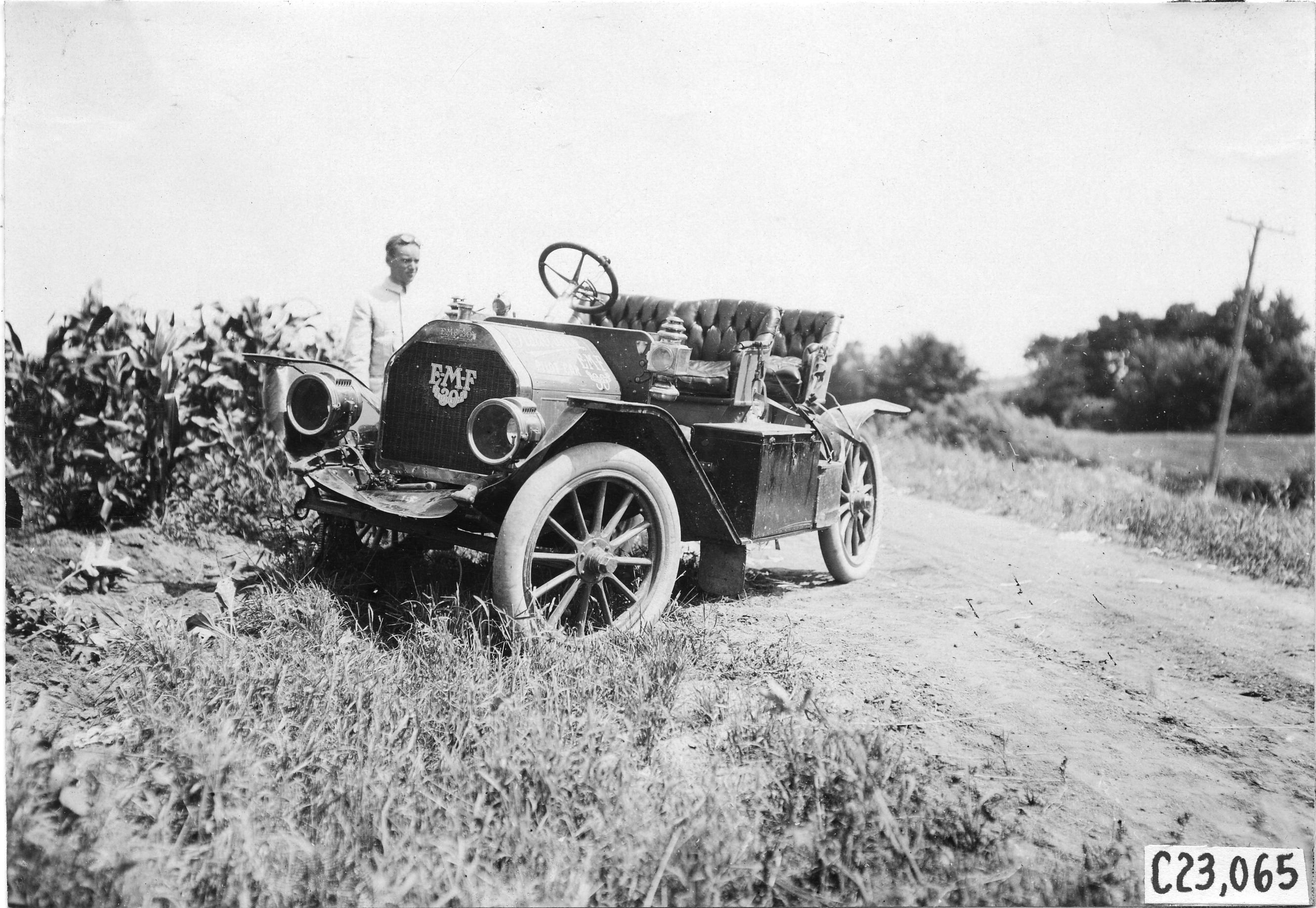 4.5x6.5 black and white photograph of tourist standing next to E.M.F car parked on side of rural road near Junction City, Kansas, at the 1909 Glidden Tour. Negative #C23,065.