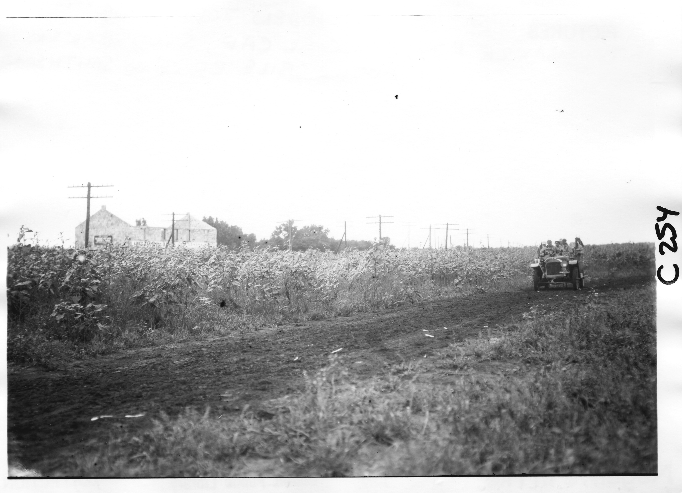 5x7 black and white photograph of Studebaker car #79 on rural road, at the 1909 Glidden Tour. Caption on photo back: 'Studebaker #79, official car, Studebaker Automobile Co., G.W. Smithson.' Negative #C254.