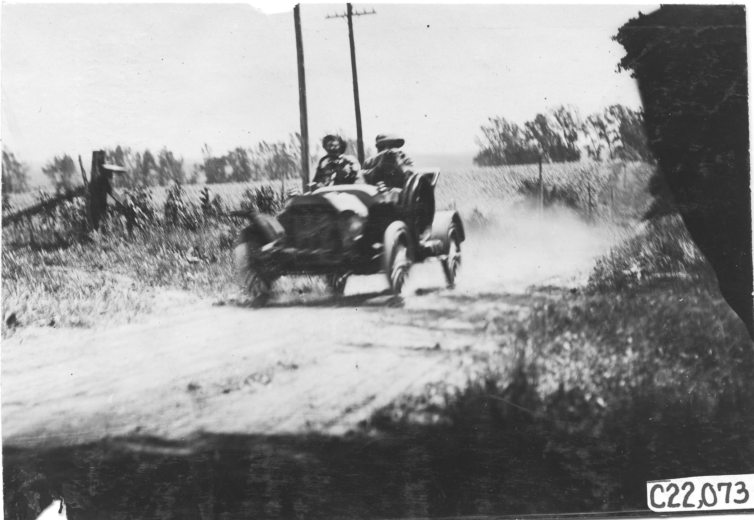 4.5x6.5 black and white photograph of Duesenberg and passenger in Mason #112 on rural road near Manhattan, Kansas, at the 1909 Glidden Tour. Negative #C22,073. Photo edges cut unevenly.