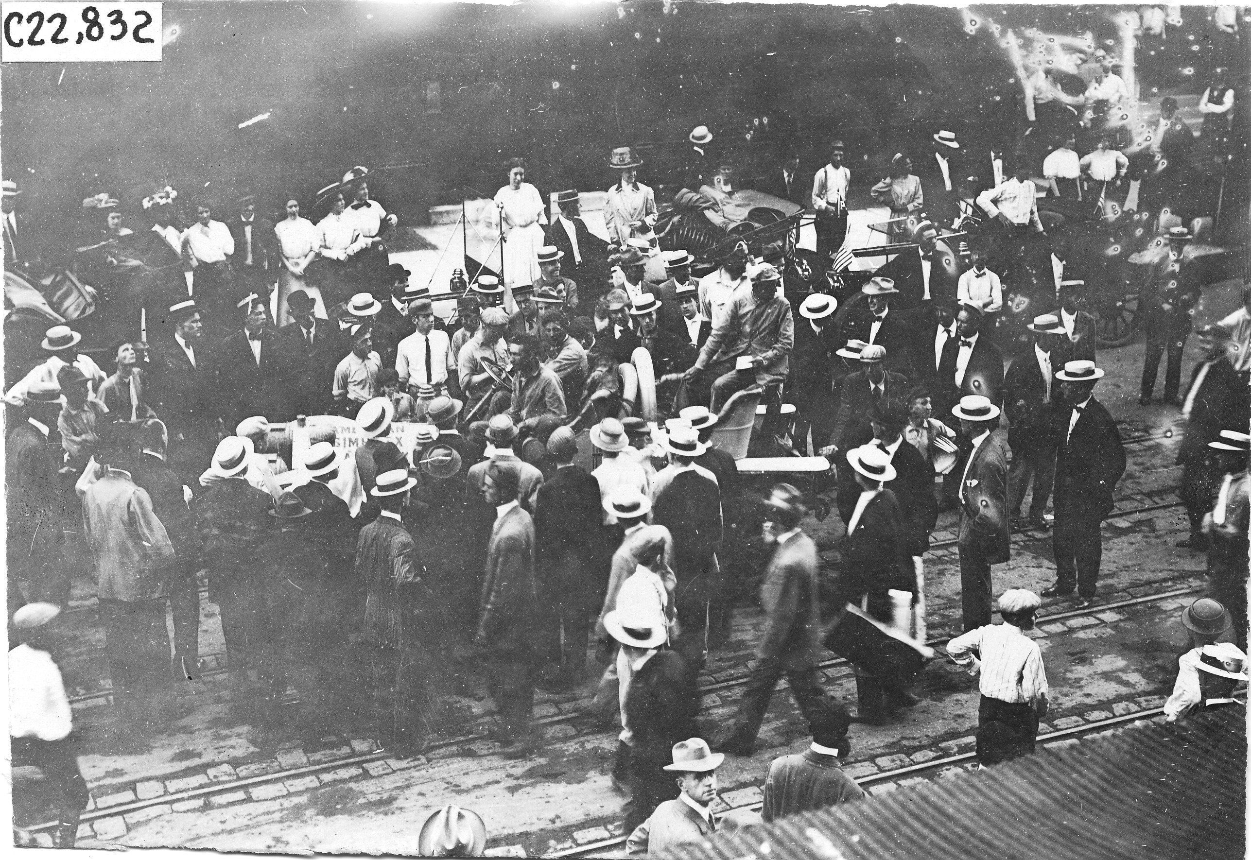 Large crowd surrounds Glidden tourist vehicles at Kansas City, Mo., at 1909 Glidden Tour