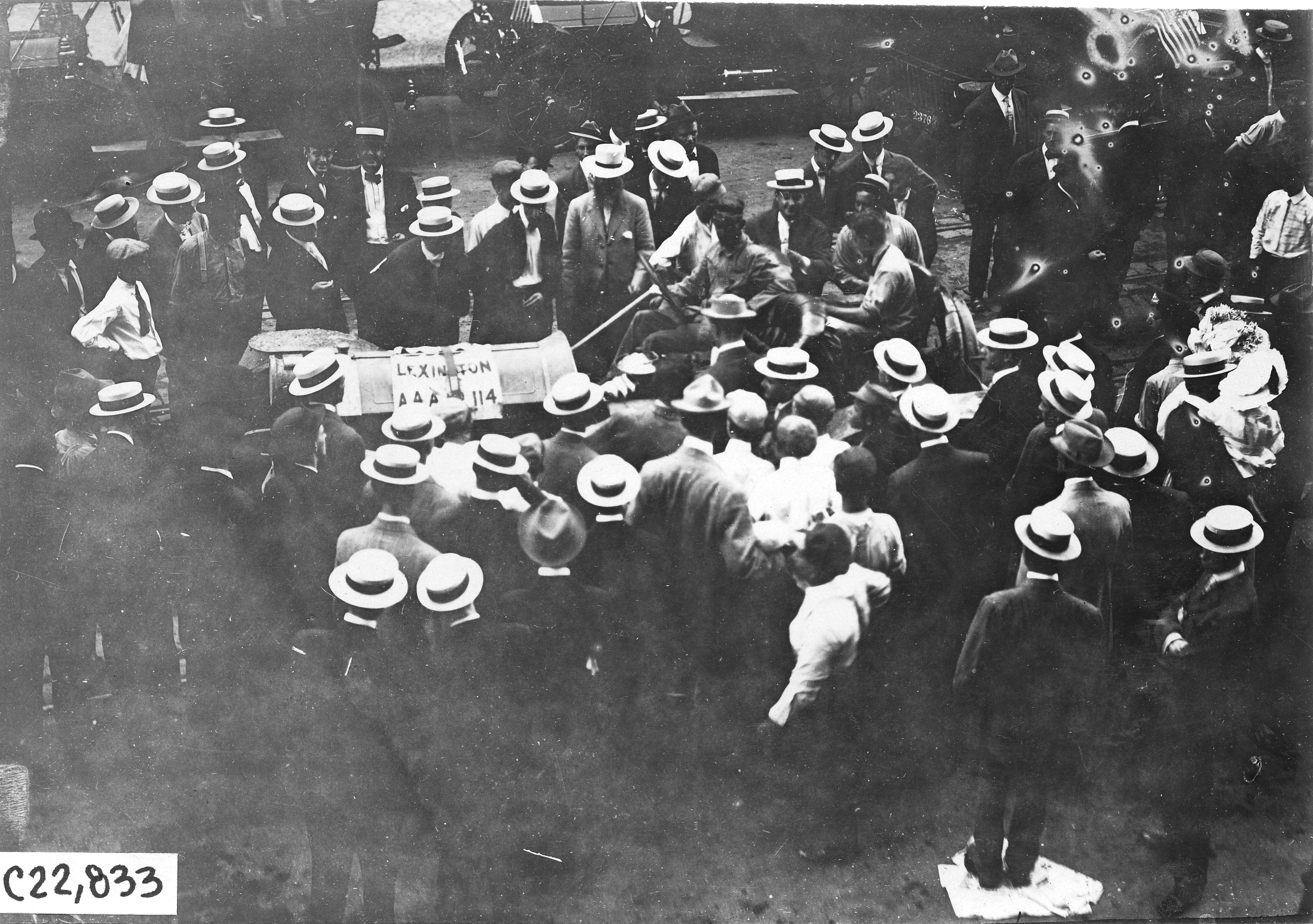 Large crowd surrounds Lexington car at Kansas City, Mo., at 1909 Glidden Tour
