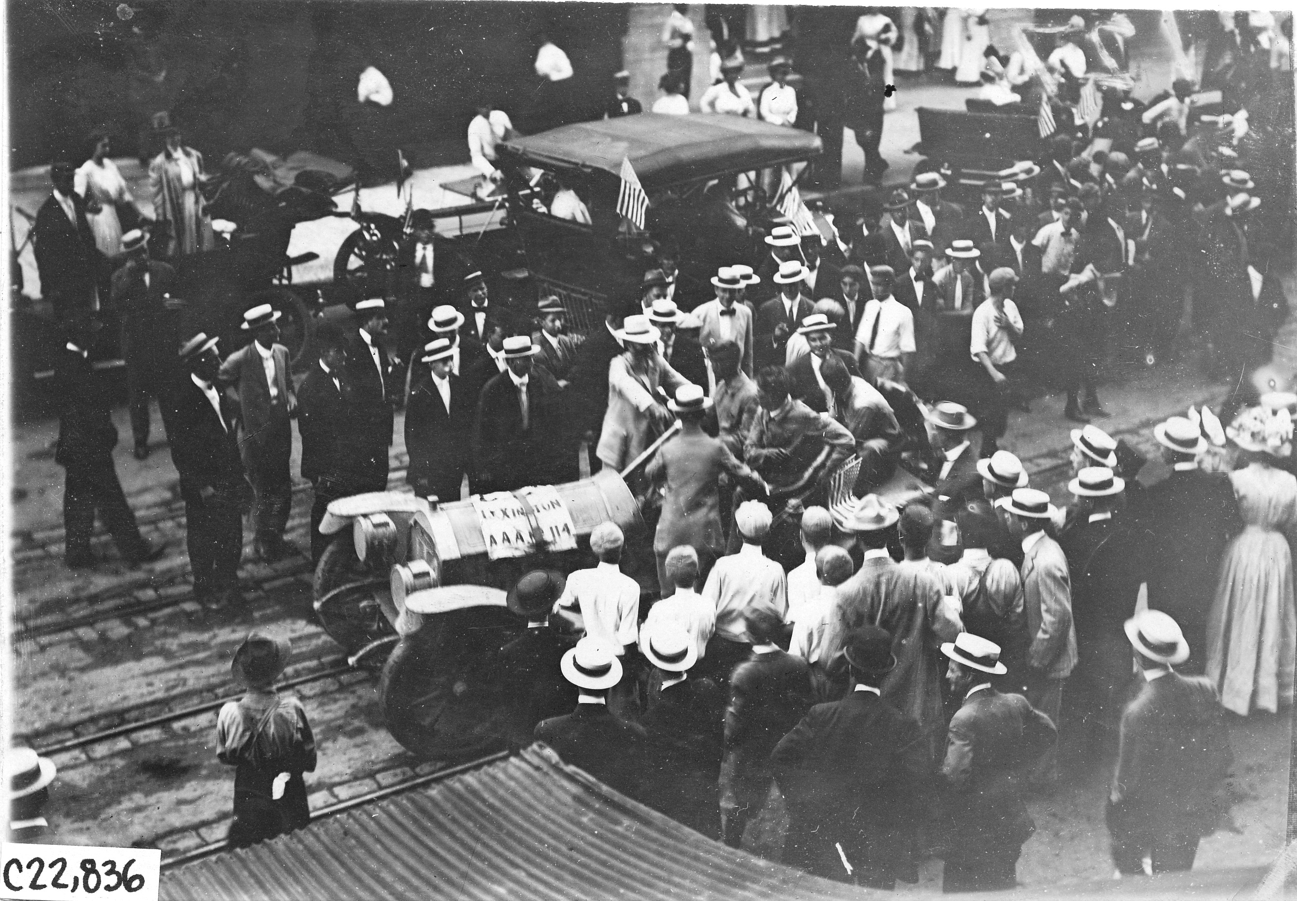 Large crowd surrounds Lexington car at Kansas City, Mo., at 1909 Glidden Tour
