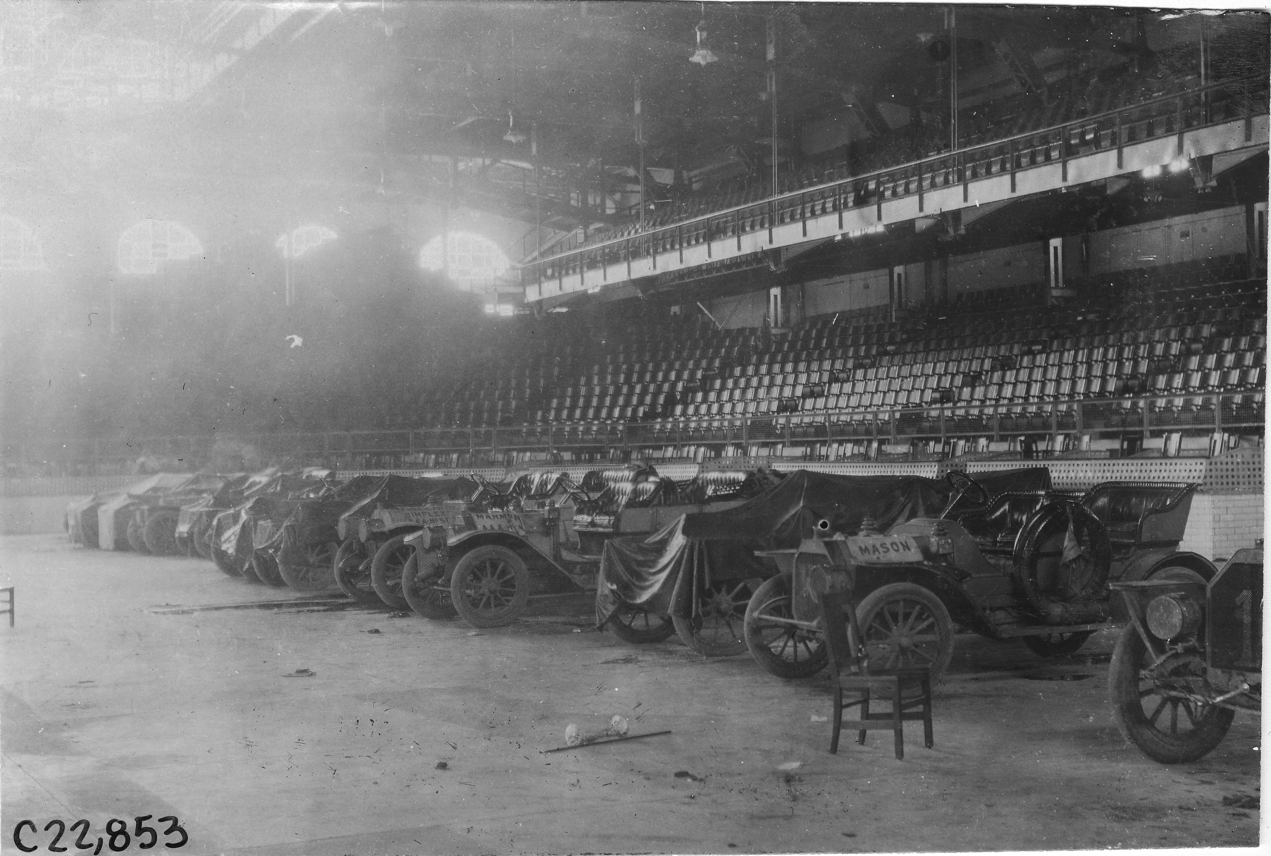 Cars parked inside the convention hall in Kansas City, Mo., at 1909 Glidden Tour
