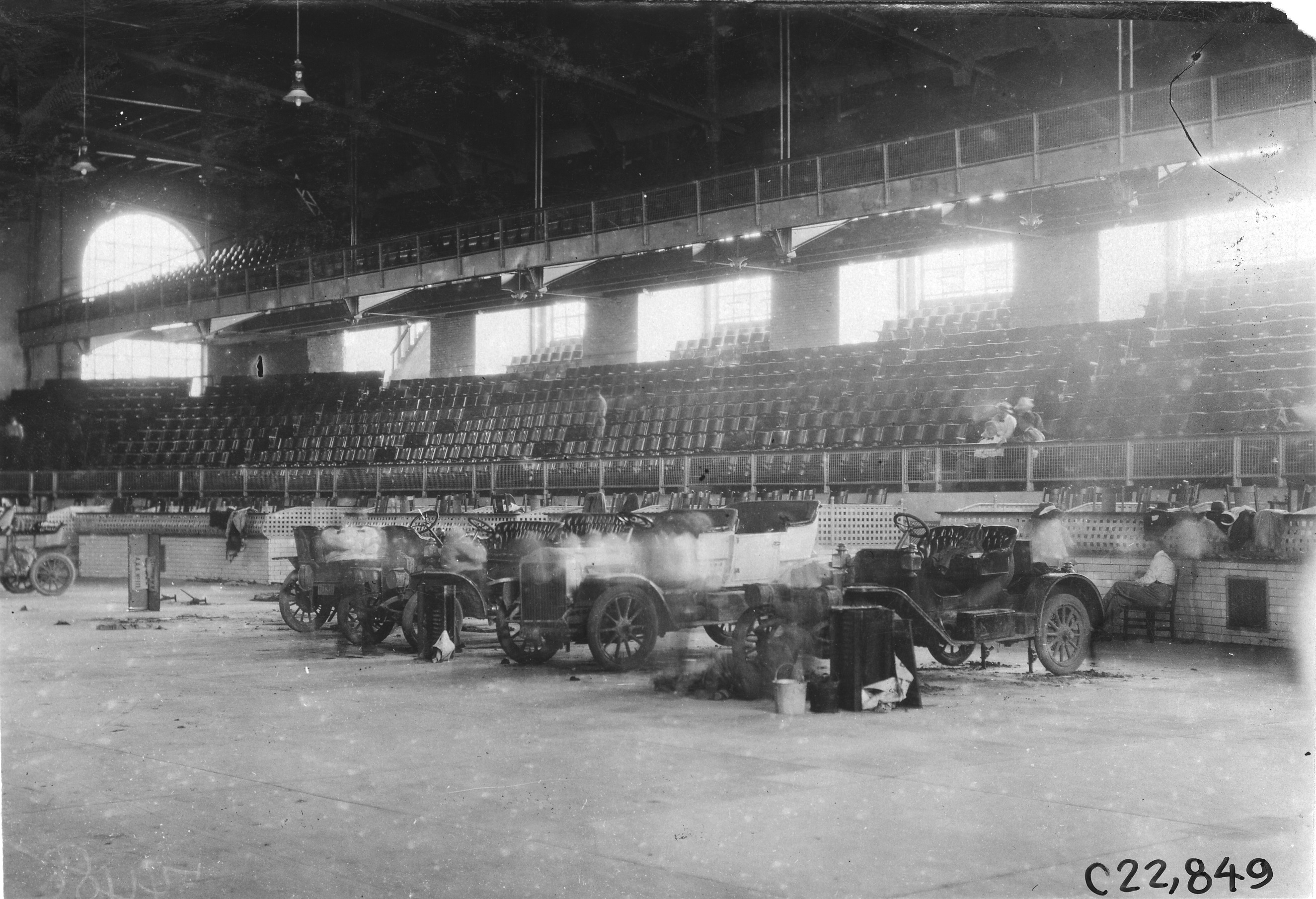 Cars parked inside the convention hall in Kansas City, Mo., at 1909 Glidden Tour