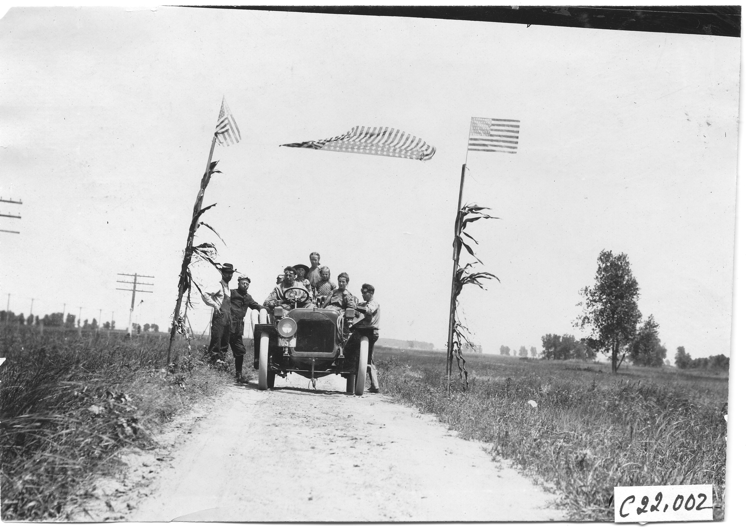 Smithson in Studebaker car on rural road, at 1909 Glidden Tour