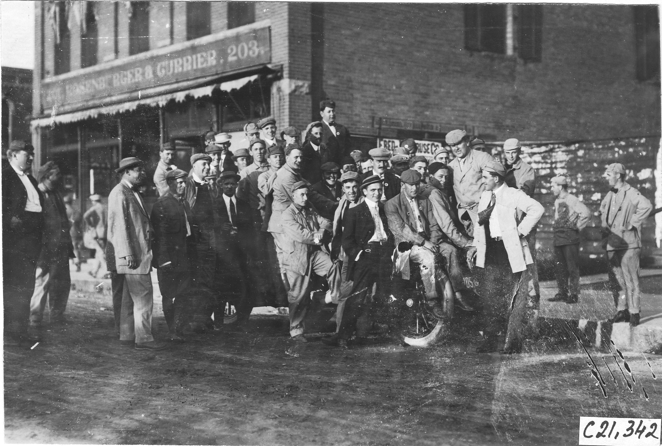 4.5x6.5 black and white photograph of George Smithson in Studebaker #79 overflowing with other tourists, at the 1909 Glidden Tour. Negative #C21,342. Photo edges cut unevenly.