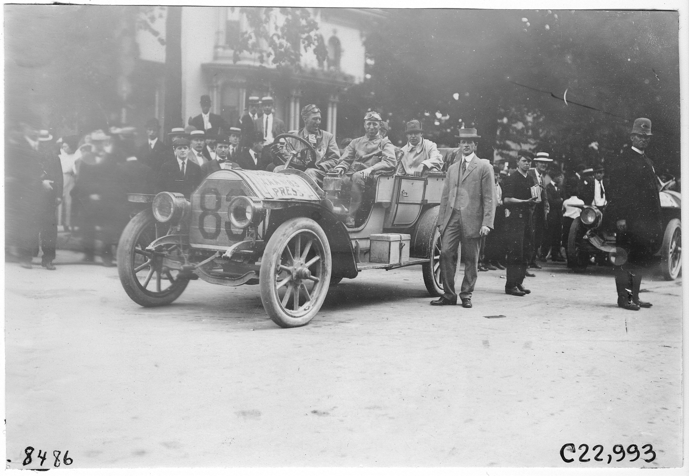Press car #83 on city street with crowd of men in background, at 1909 Glidden Tour