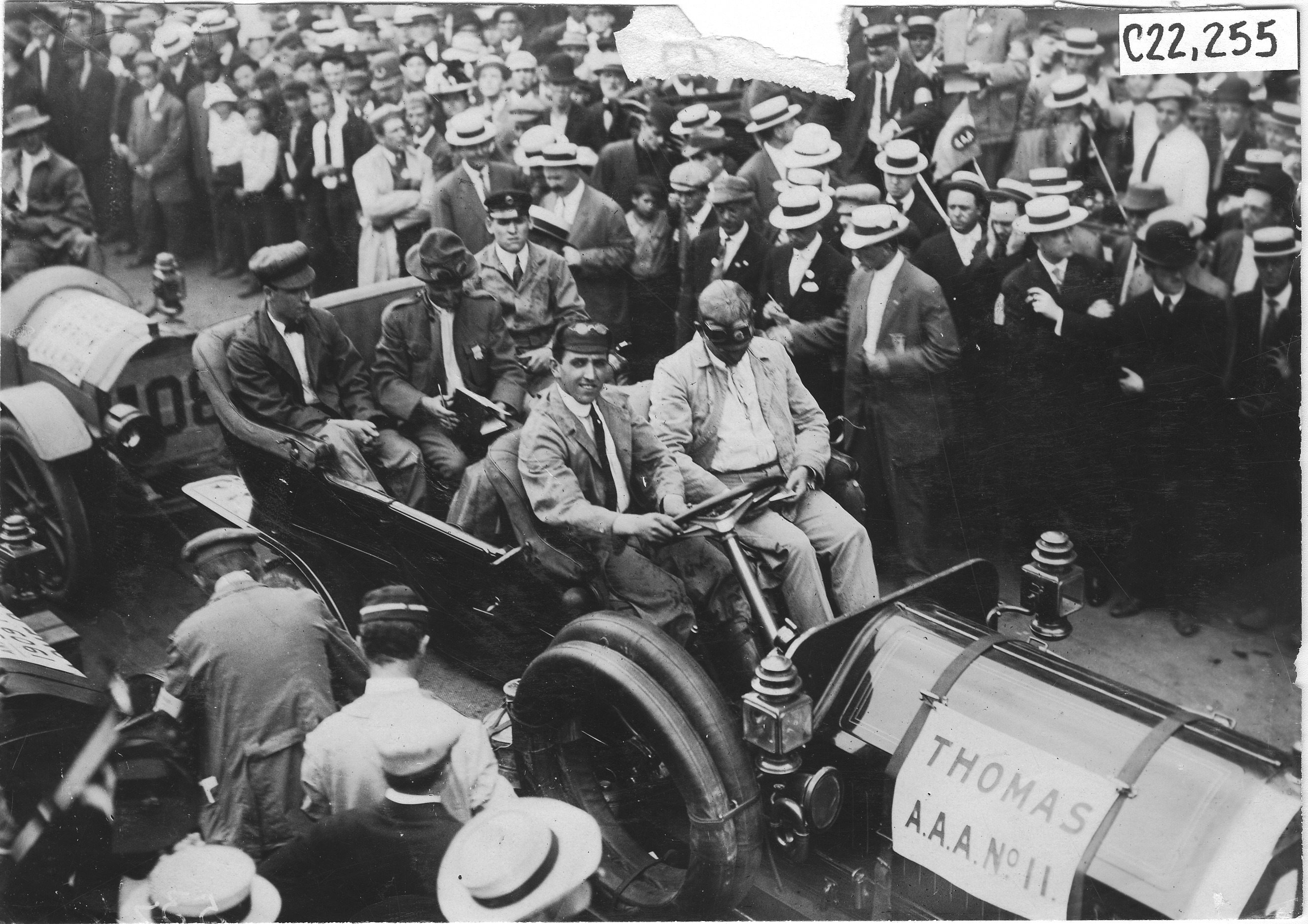 4.75x6.5 black and white photograph of Thomas #11 with driver and three passengers, surrounded by crowd of men in hats at reception for tourists in Madison, Wisconsin, at the 1909 Glidden Tour. Negative #C22,255. Top of photo is damaged. Photo edges cut unevenly.