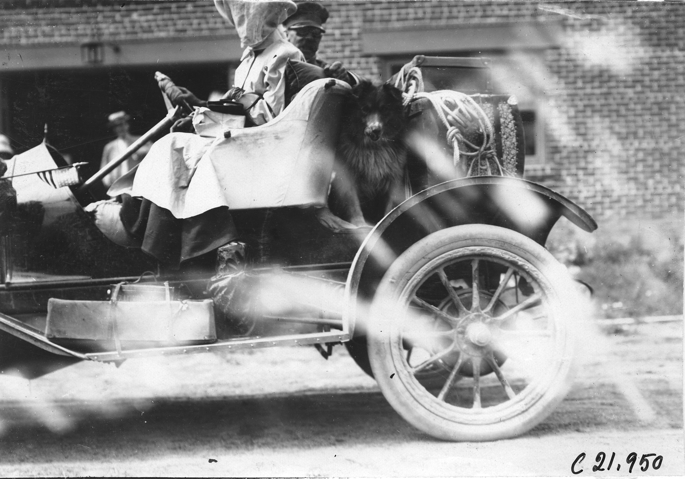 4.5x6.5 black and white photograph of a couple with a dog in an unidentified car, at the 1909 Glidden Tour. Negative #C21,950.