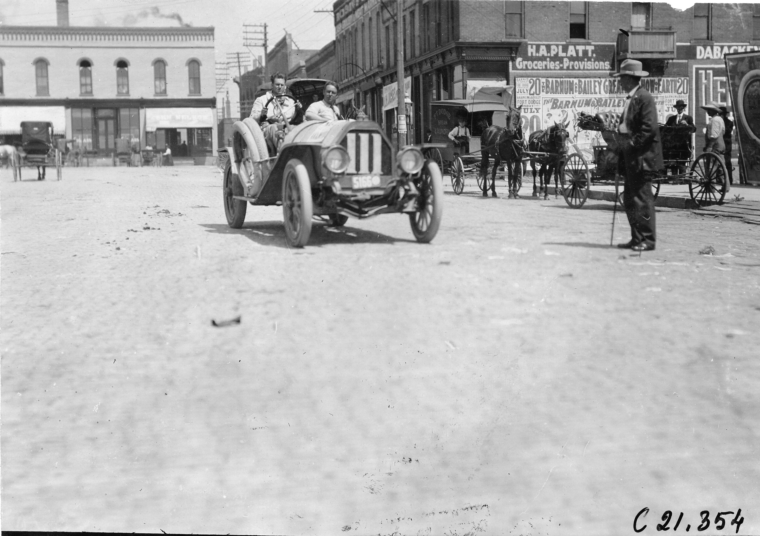 Jewel car #111 on downtown street, at the 1909 Glidden Tour