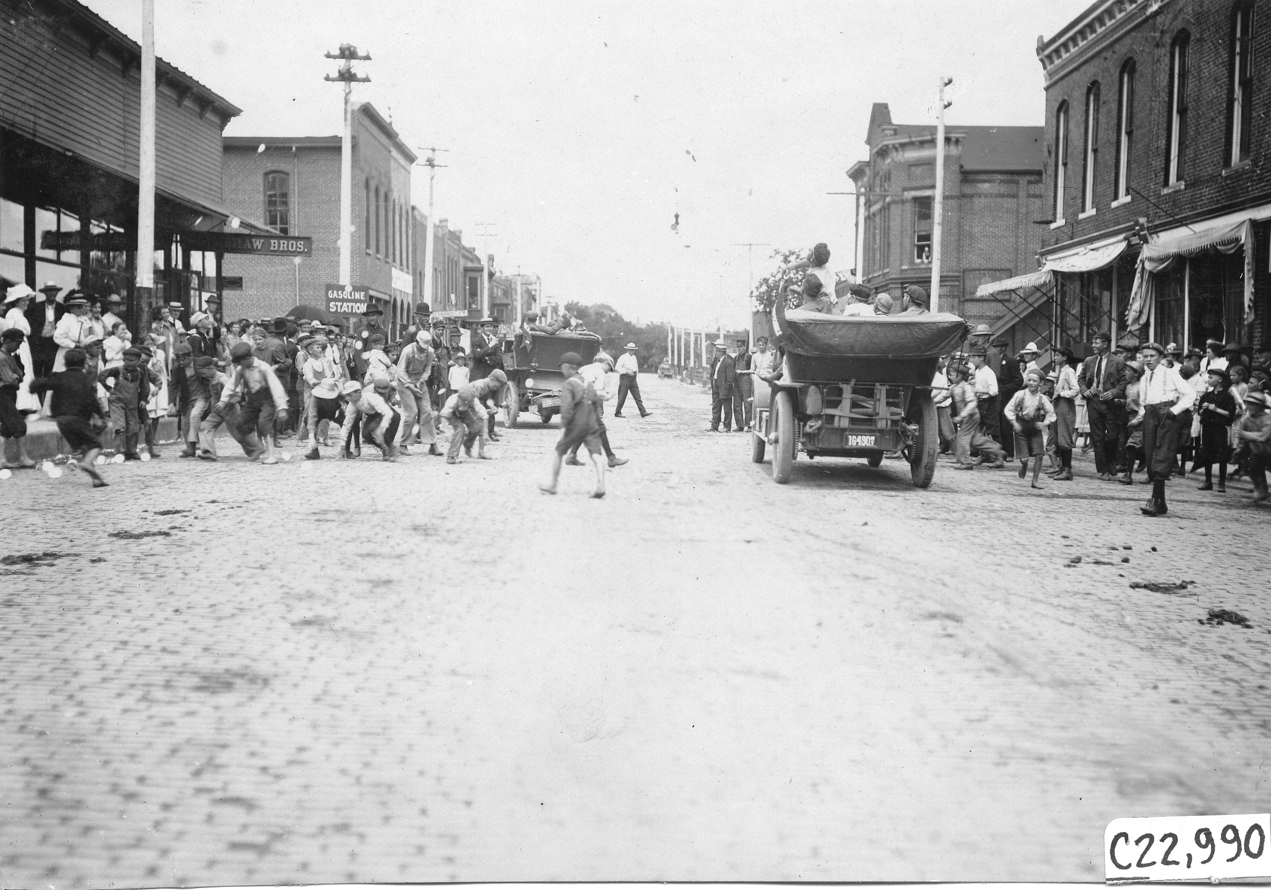 4.5x6.5 black and white photograph of tour participants on downtown street in front of businesses, a man in car is throwing something up in the air and children are running to catch it, at the 1909 Glidden Tour. Negative #C22,990. Photo edges cut unevenly.