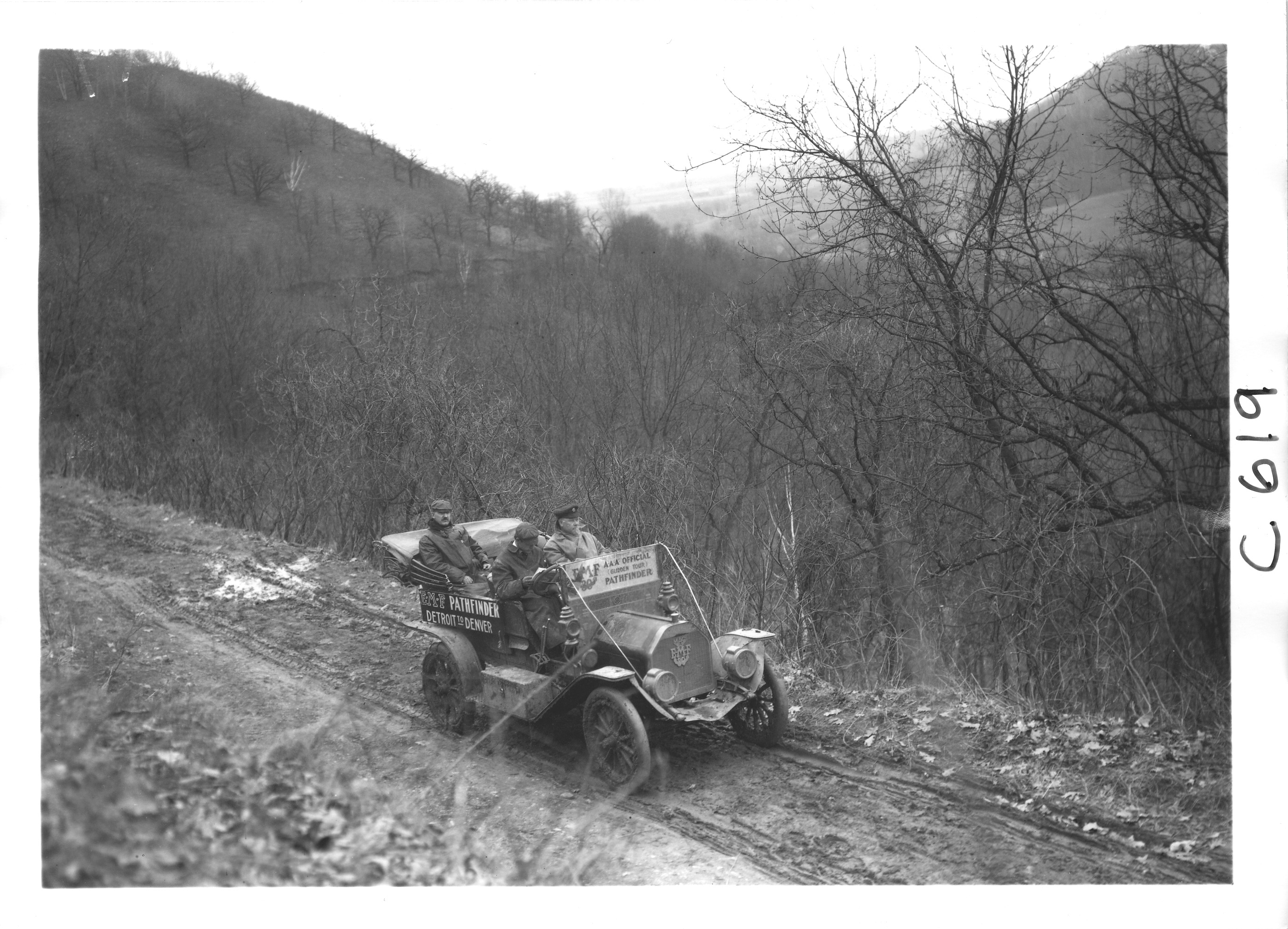 E.M.F. car on rural road in the mountains, on pathfinder tour for the 1909 Glidden Tour
