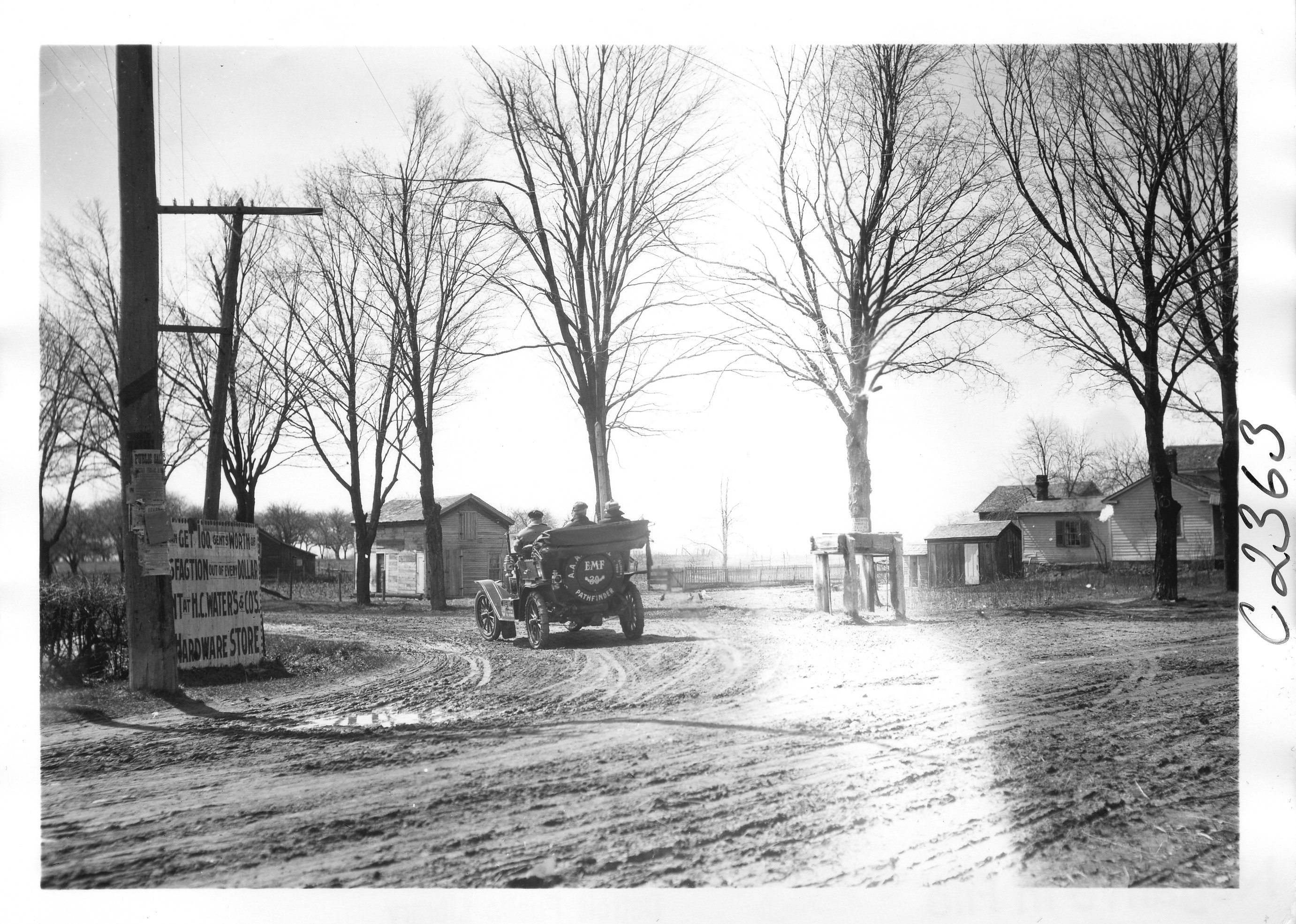 5x7 black and white photograph of Dai H. Lewis and party in E.M.F. pathfinder car near a town, advertising on roadside, some buildings by road, on pathfinding tour for the 1909 Glidden Tour. Negative #C2363.