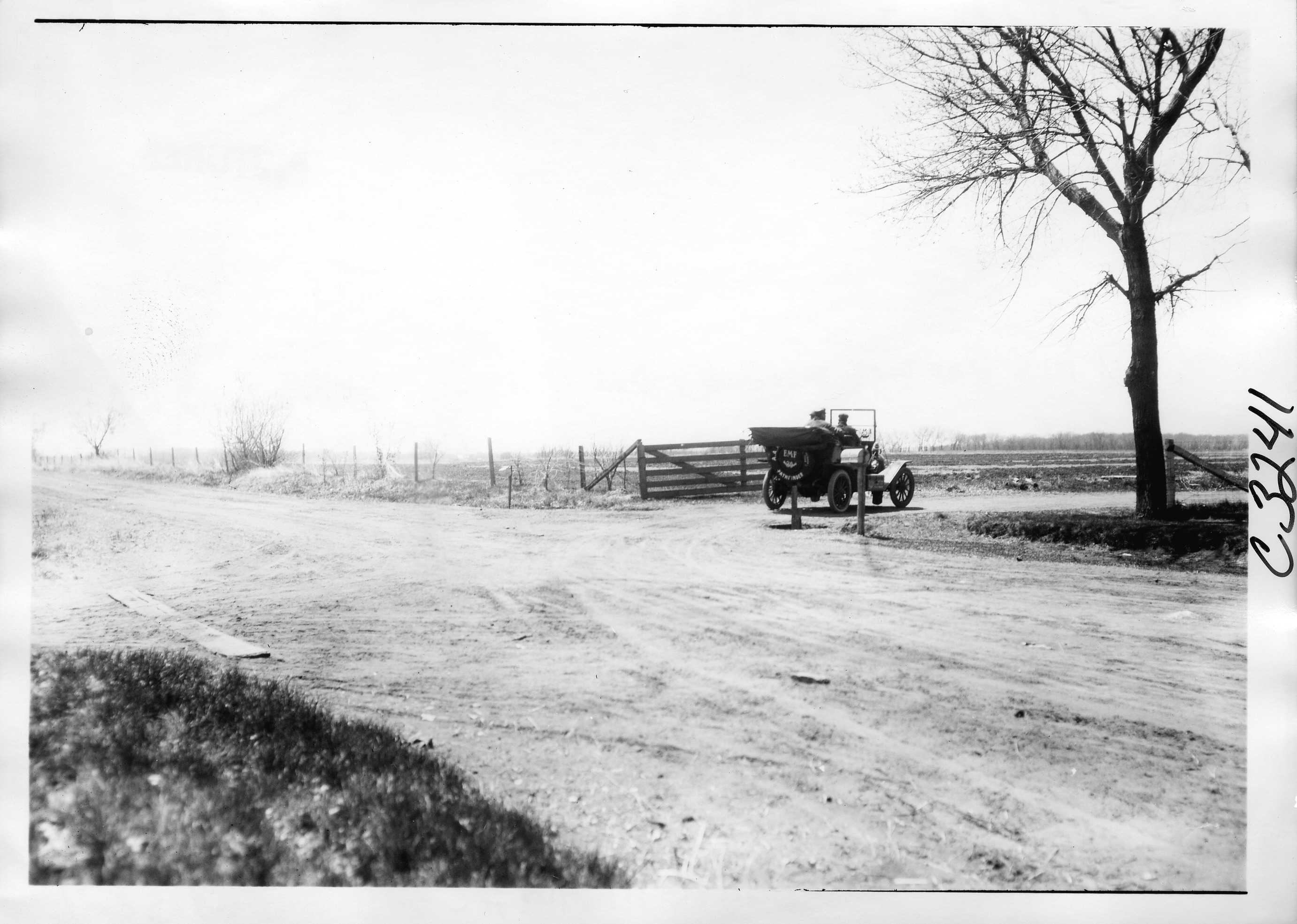 E.M.F. car rounding a corner on rural road, on pathfinder tour for 1909 Glidden Tour