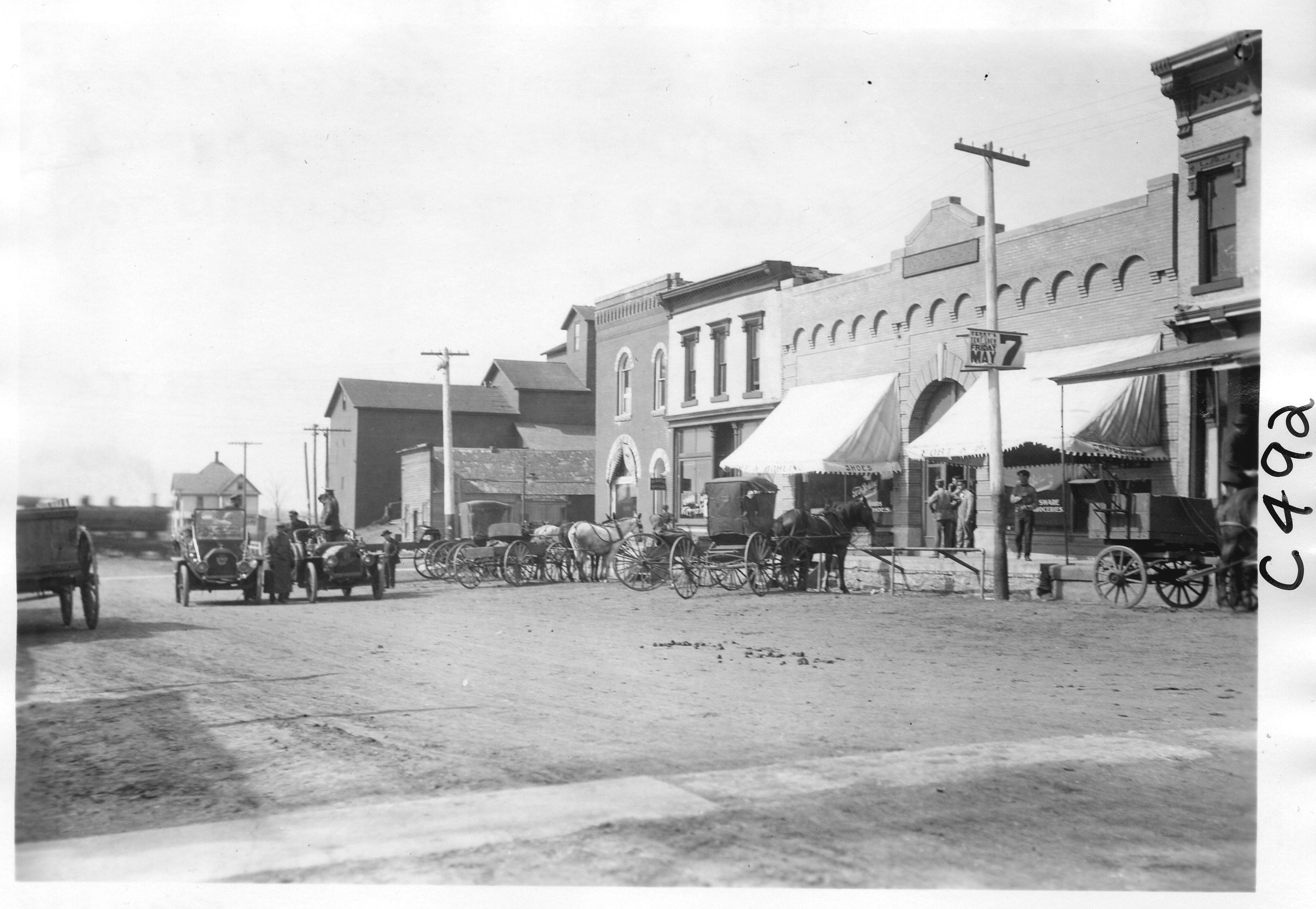 5x7 black and white photograph of Dai Lewis and party in E.M.F. car on city street near business district, horse-drawn vehicles parked in front of stores, on pathfinding tour for the 1909 Glidden Tour. Negative #C492.