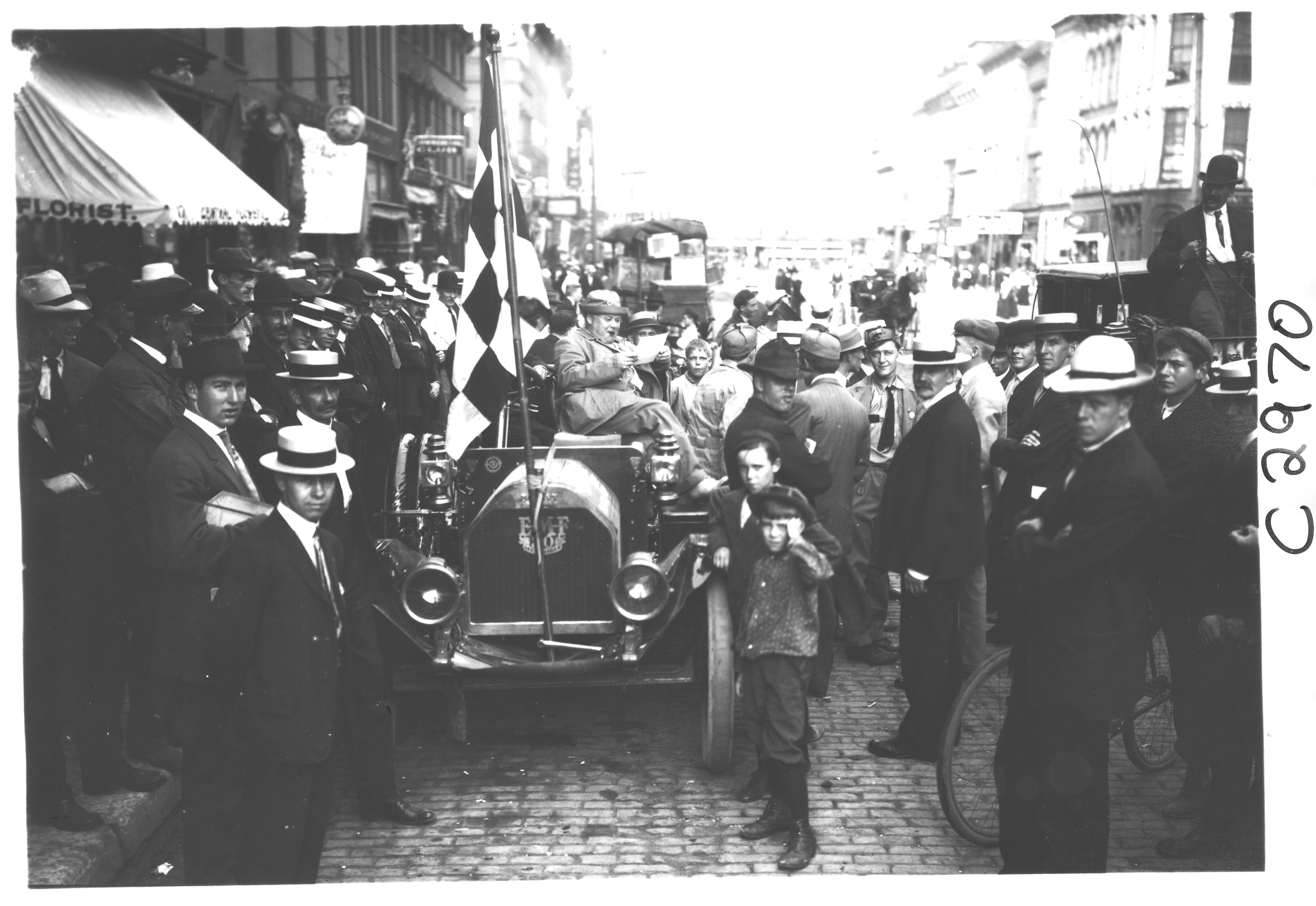 Dai Lewis in E.M.F. car surrounded by a group of men and boys, on pathfinder tour for 1909 Glidden Tour