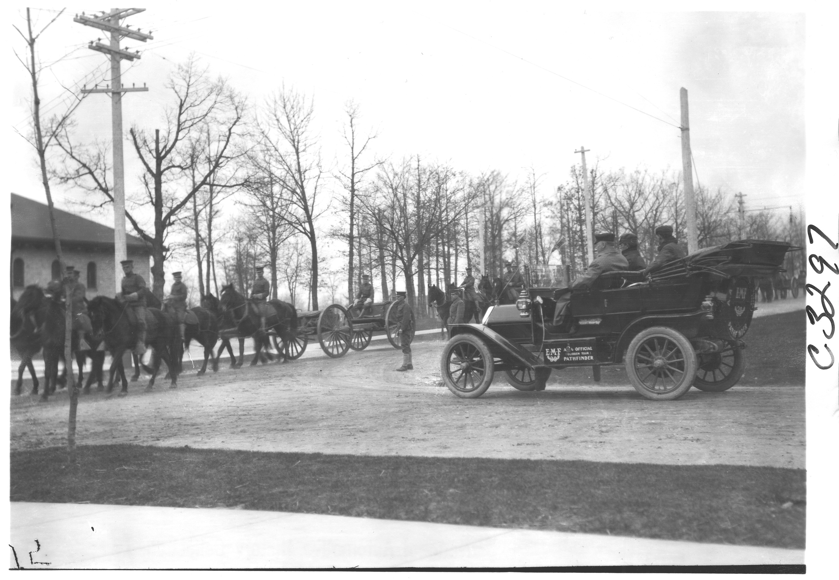 E.M.F. car stopped to allow mounted soldiers to pass, on pathfinder tour for 1909 Glidden Tour