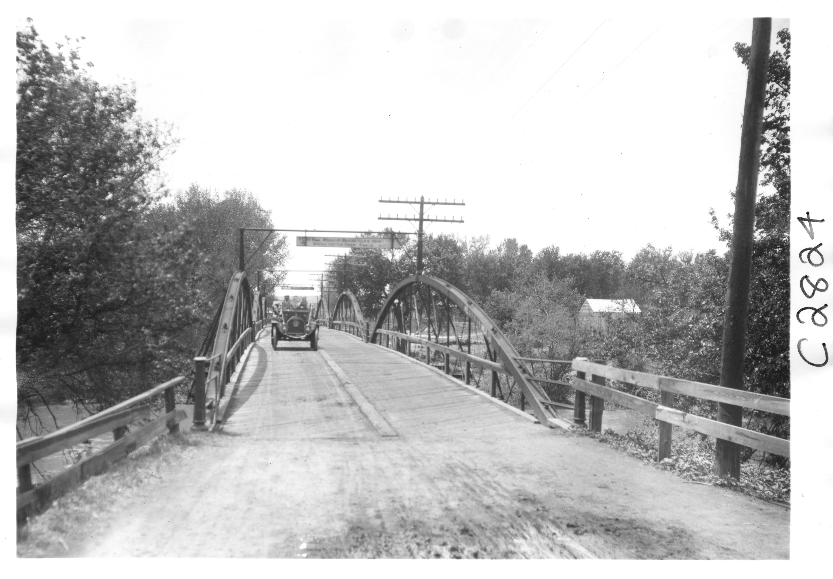 5x7 black and white photograph of E.M.F. car crossing a bridge with arched girders, sign above bridge, on pathfinding tour for the 1909 Glidden tour. Negative #C2824.