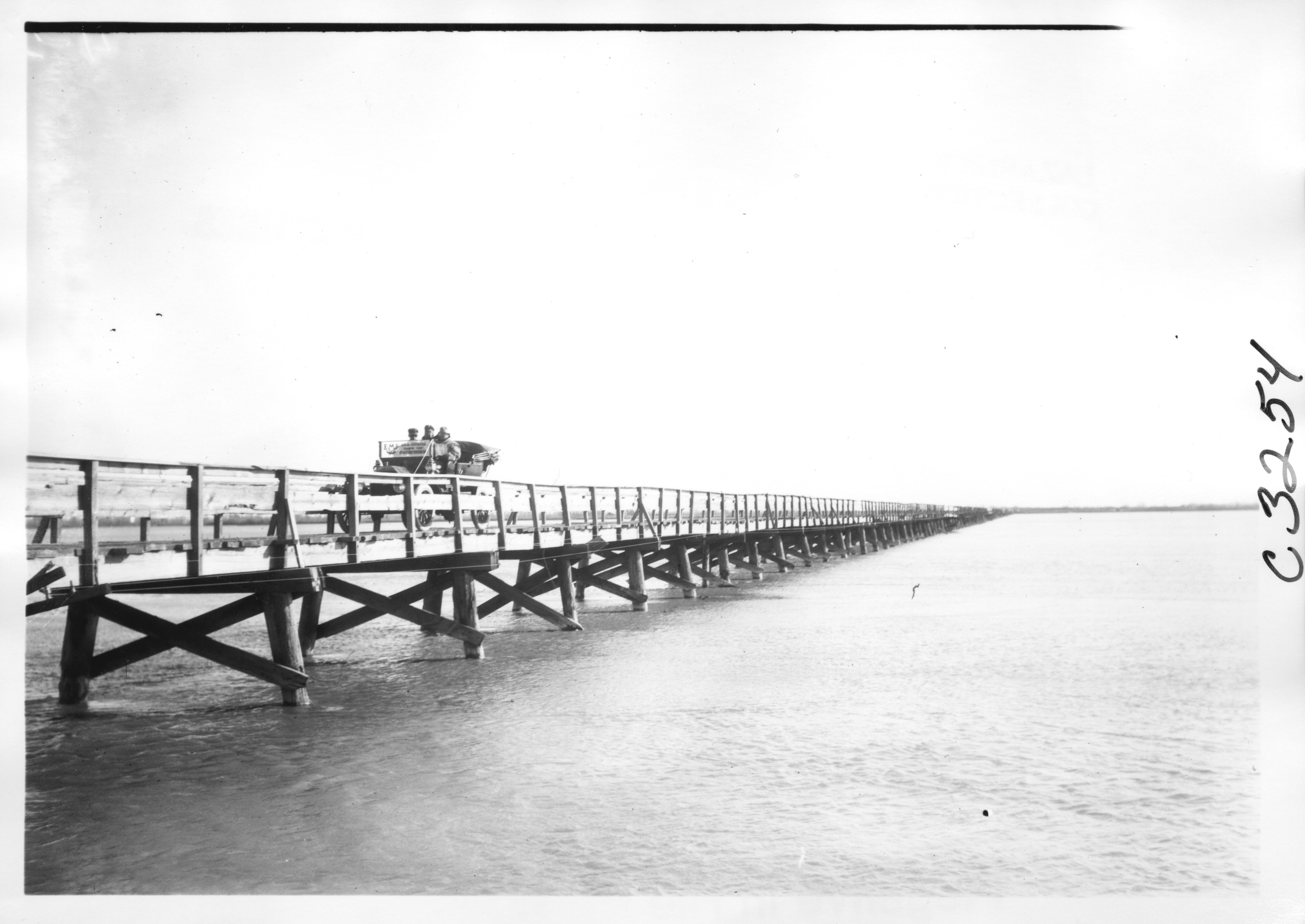 5x7 black and white photograph of E.M.F. car, side view, crossing a long, wooden bridge over a wide river, on pathfinding tour for the 1909 Glidden tour. Negative #C3254.
