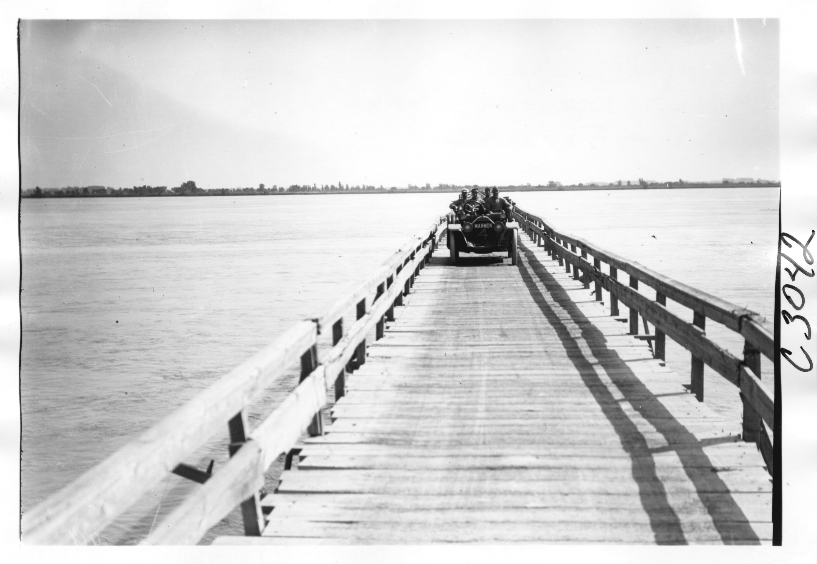 E.M.F. car crossing wooden bridge, on pathfinder tour for 1909 Glidden Tour