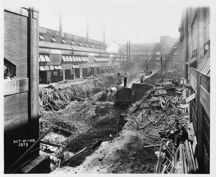 8x10 black and white photograph from glass negative 4049 of the Dodge Brothers die shop showing the yard between buildings with a steam shovel and construction materials, the image is inscribed 'Oct-21-1915' and '2873.'