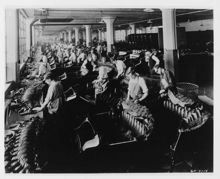 8x10 black and white photograph of the Dodge Brothers upholstery department showing men upholstering automobile seats.