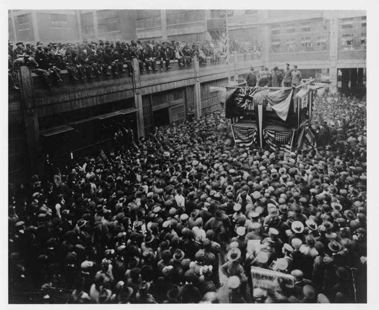 8x10 black and white photograph of a Liberty Loan rally at Dodge Brothers showing a large crowd gathered around the Dodge brothers and other men on an elevated podium.