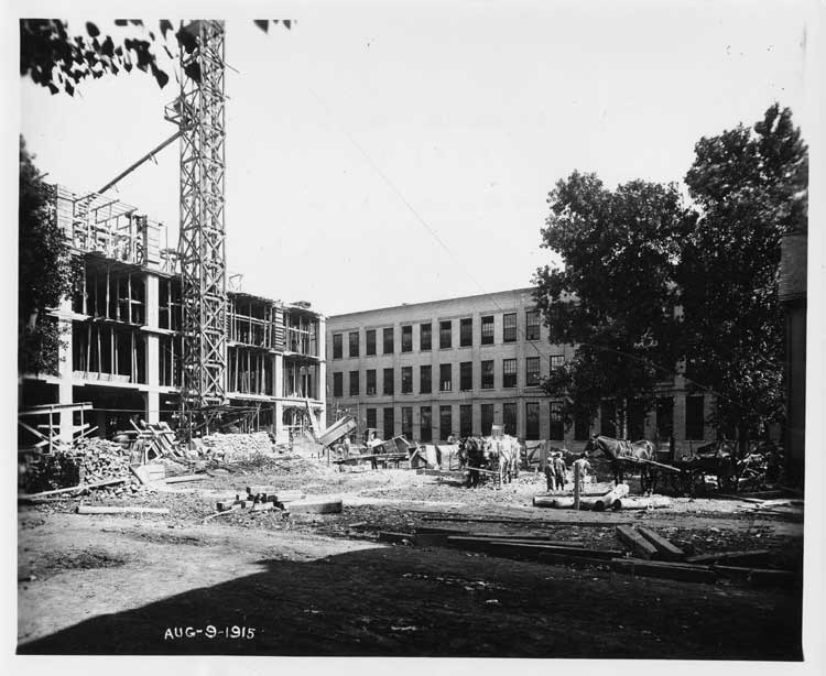 8x10 black and white photograph of construction work at the Northway Motor and Manufacturing Company showing horse-drawn wagons, the image is inscribed 'Aug-9-1915.'