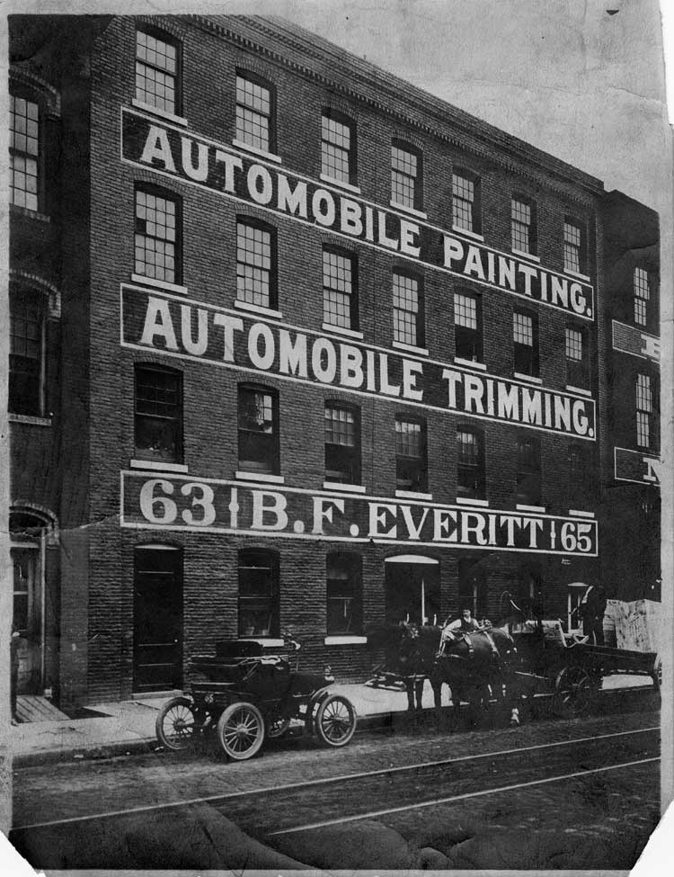 6.5x8.5 black and white photograph of the B.F. Everitt Company building located at 63-65 Fort Street showing a car and a horse-drawn wagon in the street in front of the building.