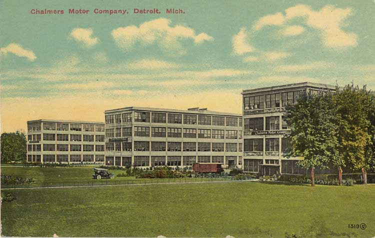 3.5x5.5 color postcard of Chalmers Motor Company factory exterior.