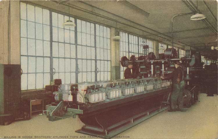 3.5x5.5 color postcard of the interior of Dodge Brothers factory showing milling of cylinder tops and heads.