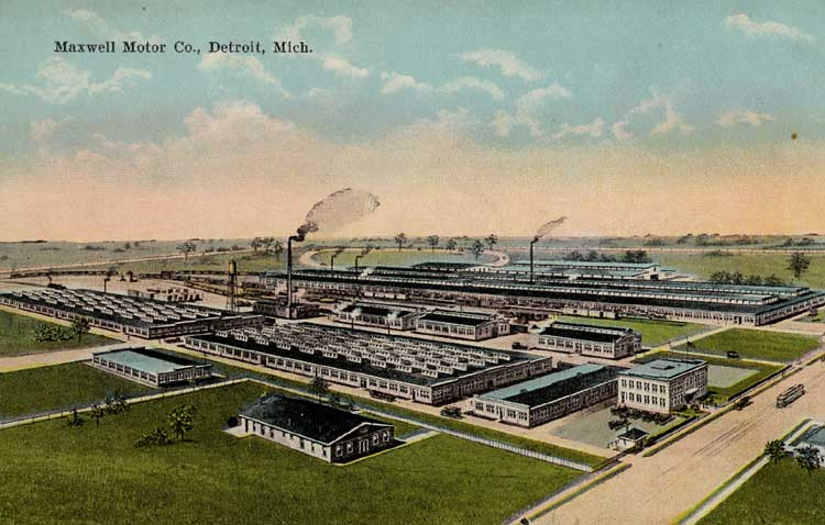 3.5x5.5 color postcard showing birds-eye view of the Maxwell Motor Company factory.