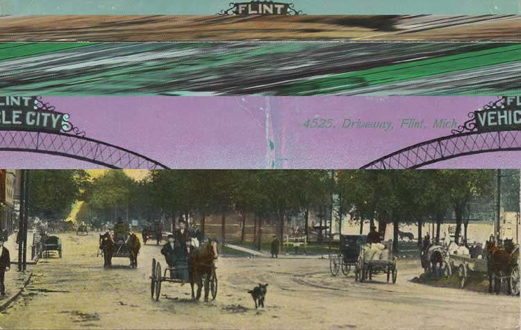 3.5x5.5 color postcard of 4525 Driveway in Flint, Michigan with horse-drawn buggies, seen through wrought iron arch with sign 'Flint Vehicle City.'