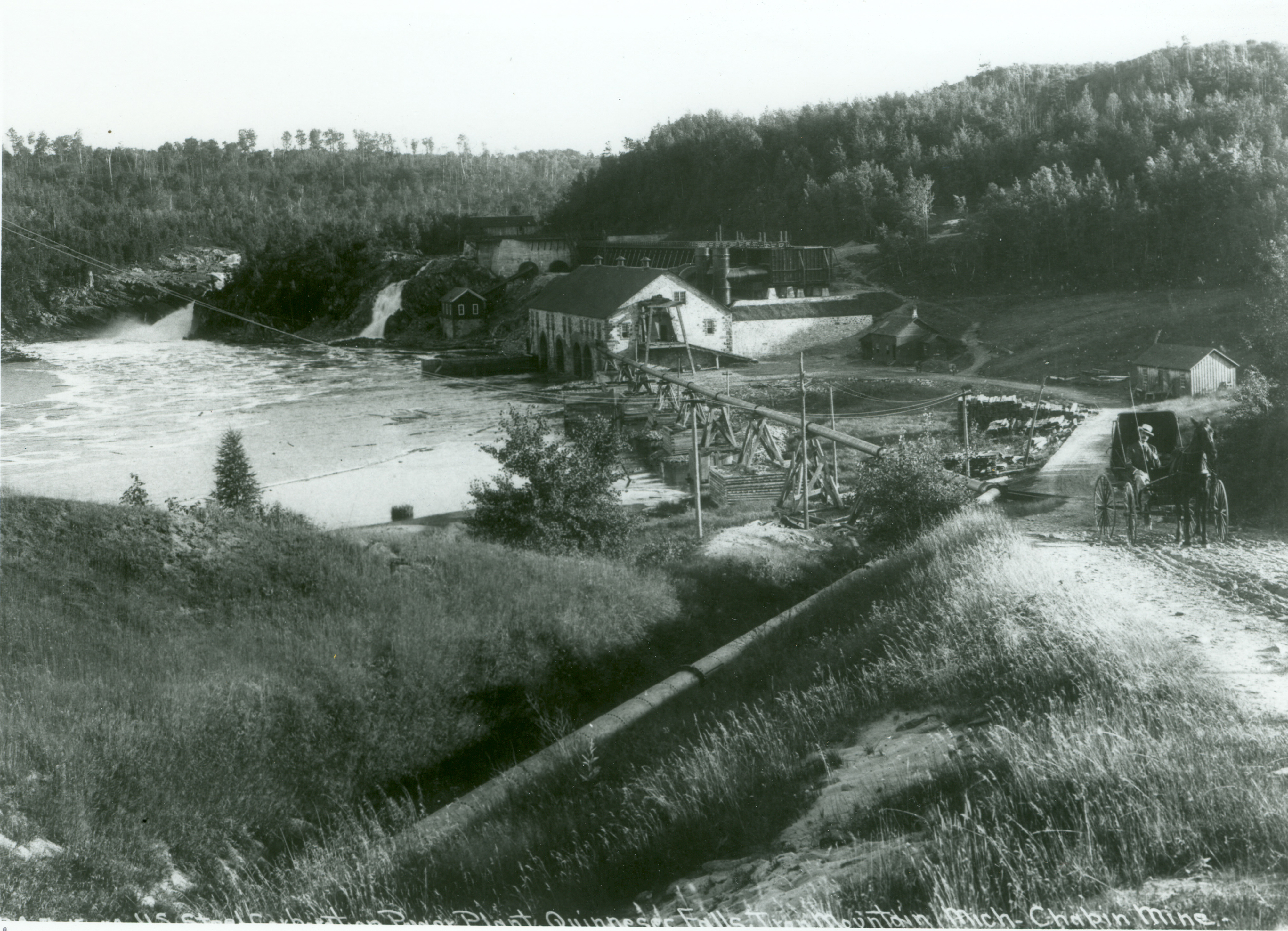 Photograph of the Hydraulic Power Company's plant at Quinnesec Falls on the Menominee River in Iron Mountain, Michigan. A pipeline supplying compressed air to the Chapin, Ludington, and Emmet mines runs from the stone compressor building. Gust Tollen drives the horse and buggy that also appears in the photograph. 'US steel fabrication power plant Quinnesec Falls Iron Mountain Mich. Chapin Mine' is printed on the photograph.
