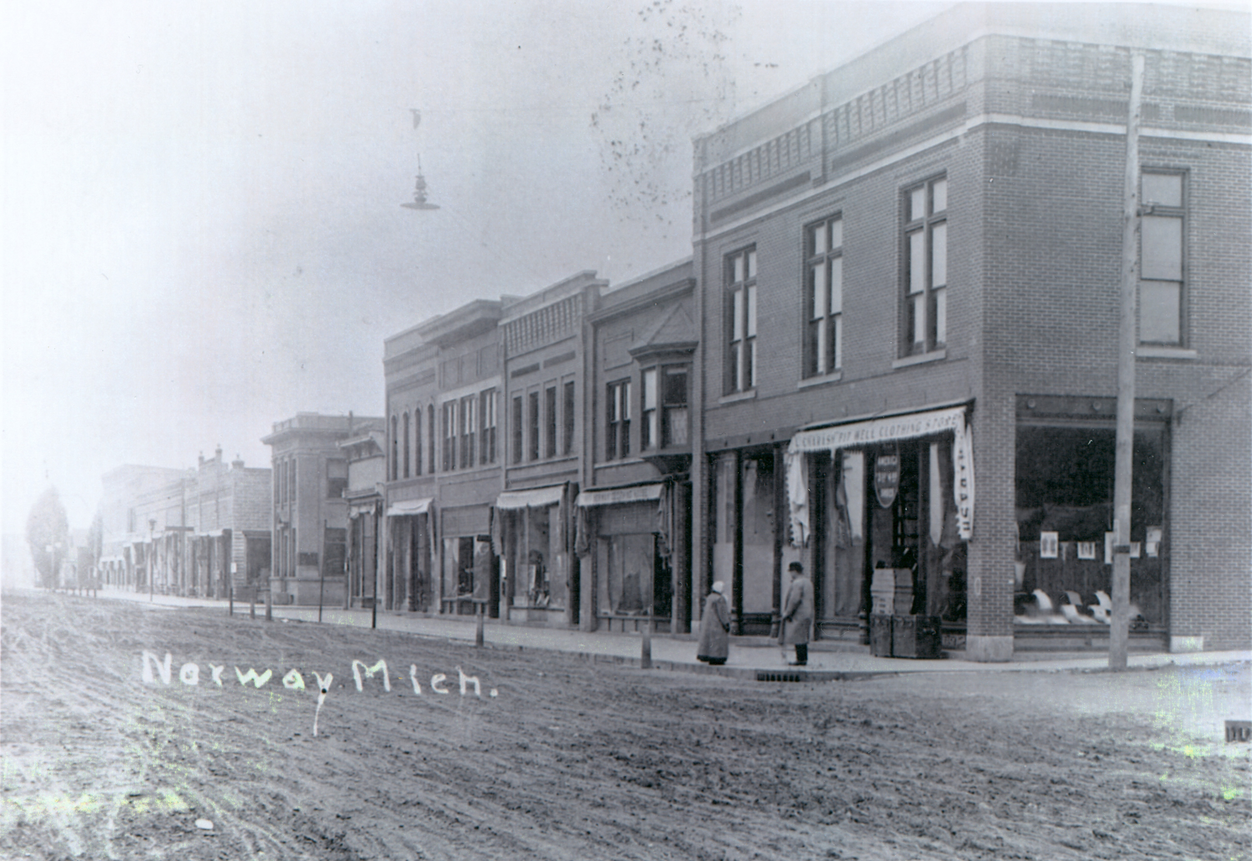 Photograph of the west side of Norway, Michigan's Nelson Street (later became Main Street) looking south. Lazarus Charash's Fit Well Clothing Store is on the corner. 'Norway Mich.' is printed on the photograph.
