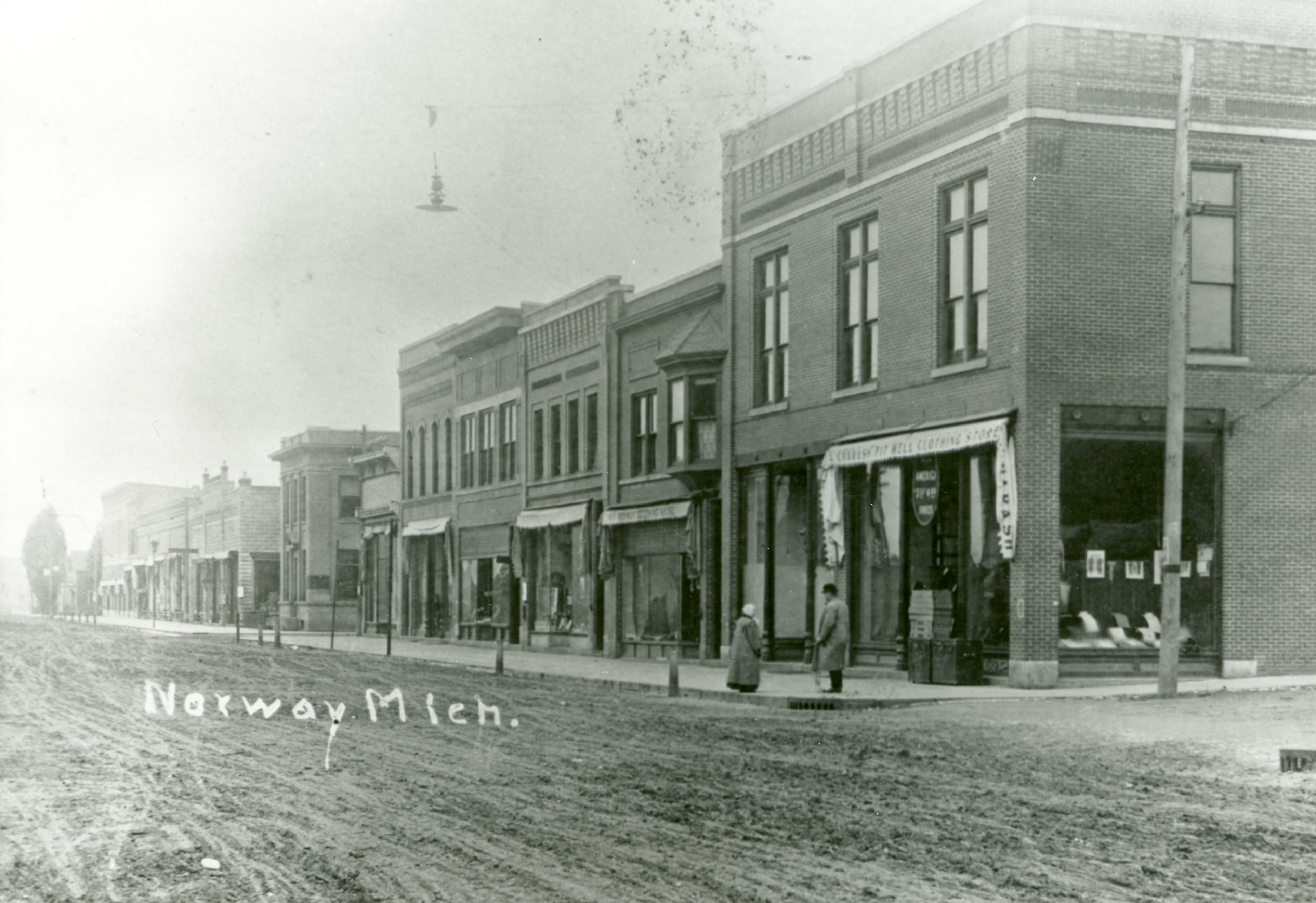 Photograph of the west side of Norway, Michigan's Nelson Street (later became Main Street) looking south. Lazarus Charash's Fit Well Clothing Store is on the corner. 'Norway Mich.' is printed on the photograph.