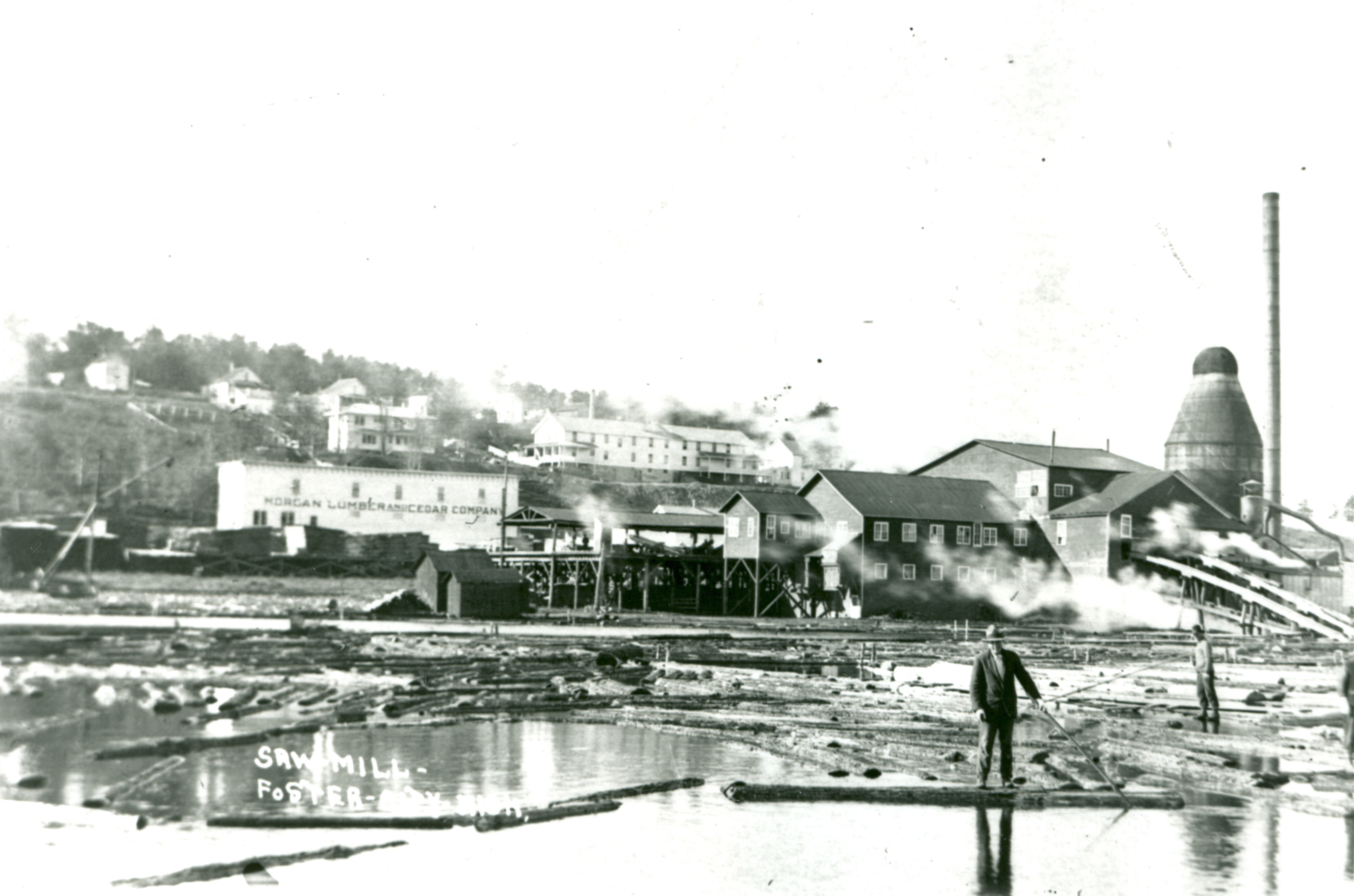 Photograph of the Morgan Lumber and Cedar Company's sawmill in Foster City, Michigan. Buildings pictured include the sawdust burner, company store and boardinghouse. 'Sawmill - Foster-city-Mich.' is printed on the photograph.