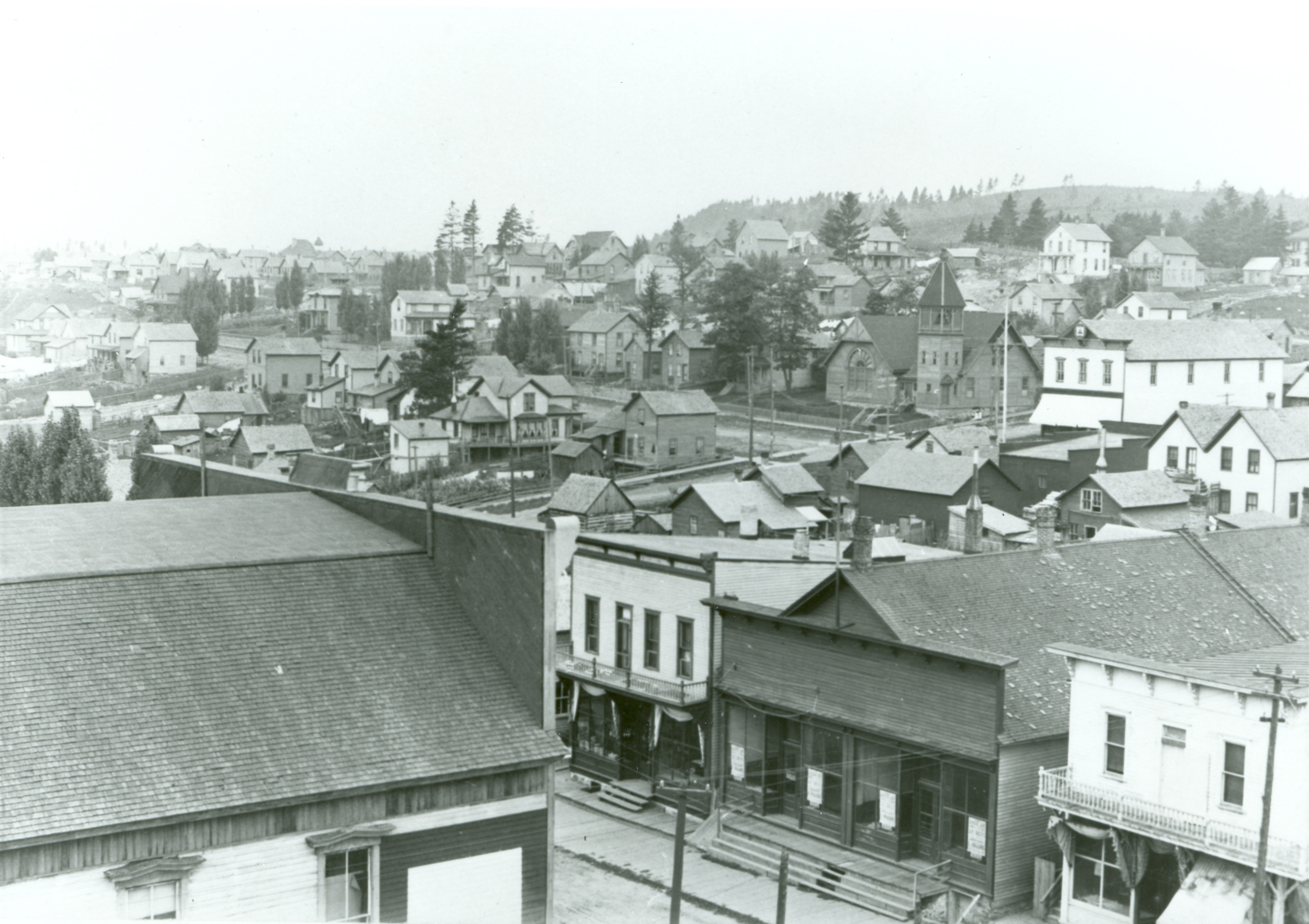 Photograph of the north side of the 100 block of Iron Mountain's West Ludington Street. Buildings pictured include a hardware store and opera house, private residence, grocery store, second-hand store, saloon, grocery store, Chinese laundry and church.