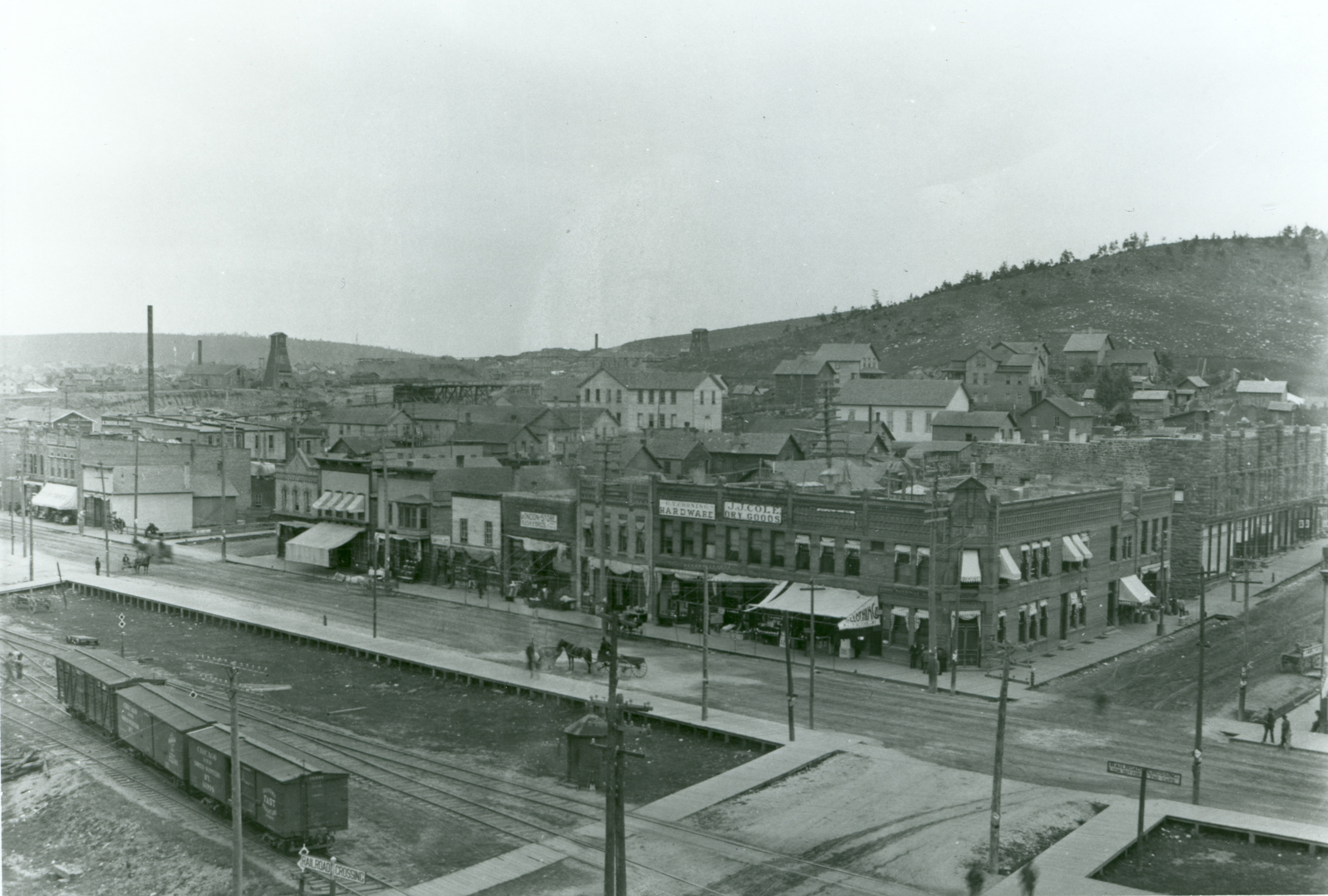 Photograph of South Stephenson Avenue with buildings including the Wood Sandstone Block which served as City Hall from 1900-1990's. Also pictured are the Brown Street School, hardware store, saloons and First National Bank among others. 'J.T. Cole Dry Goods' is printed on the photograph.