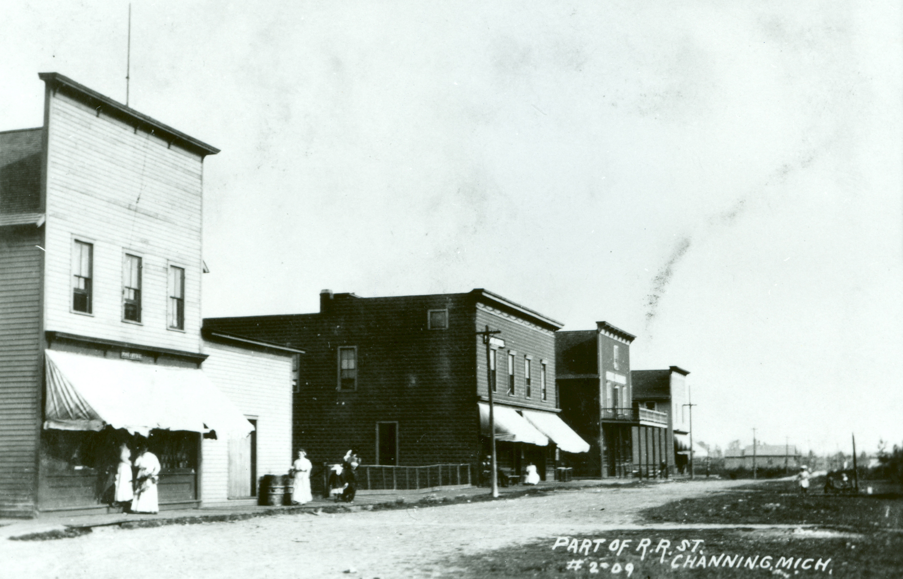 Photograph of east side of Channing's Railroad Street with buildings including the general store, St. Paul Saloon, hotel and a billiard parlor and barbershop at the end of the block.