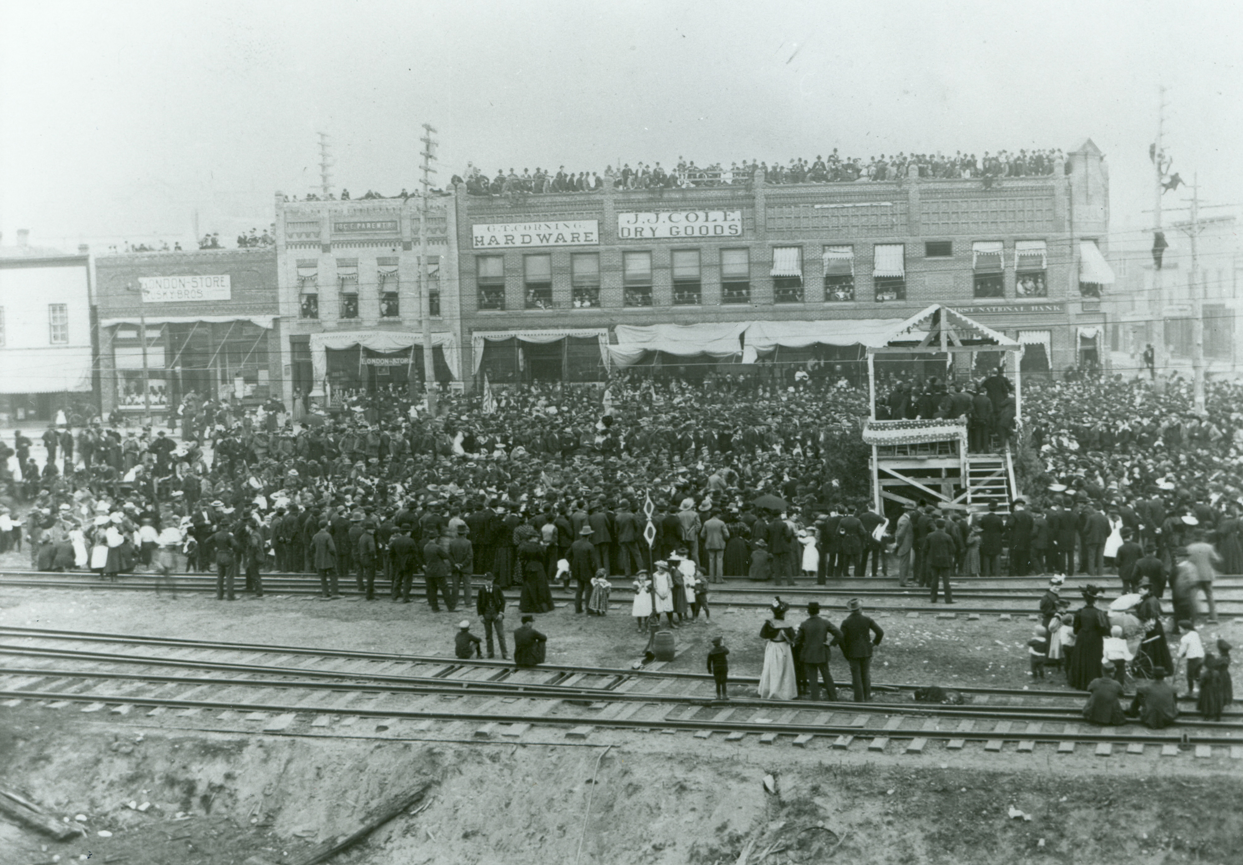 Photograph of the crowd listening to a campaign speech by William Jennings Bryan in 1896. Businesses visible in the 200 block of South Stephenson Avenue include the London Store, G.T. Corning hardware, J.J. Cole dry goods, E.J. Ingram, druggist, C.E. Steller, jeweler and the First National Bank.