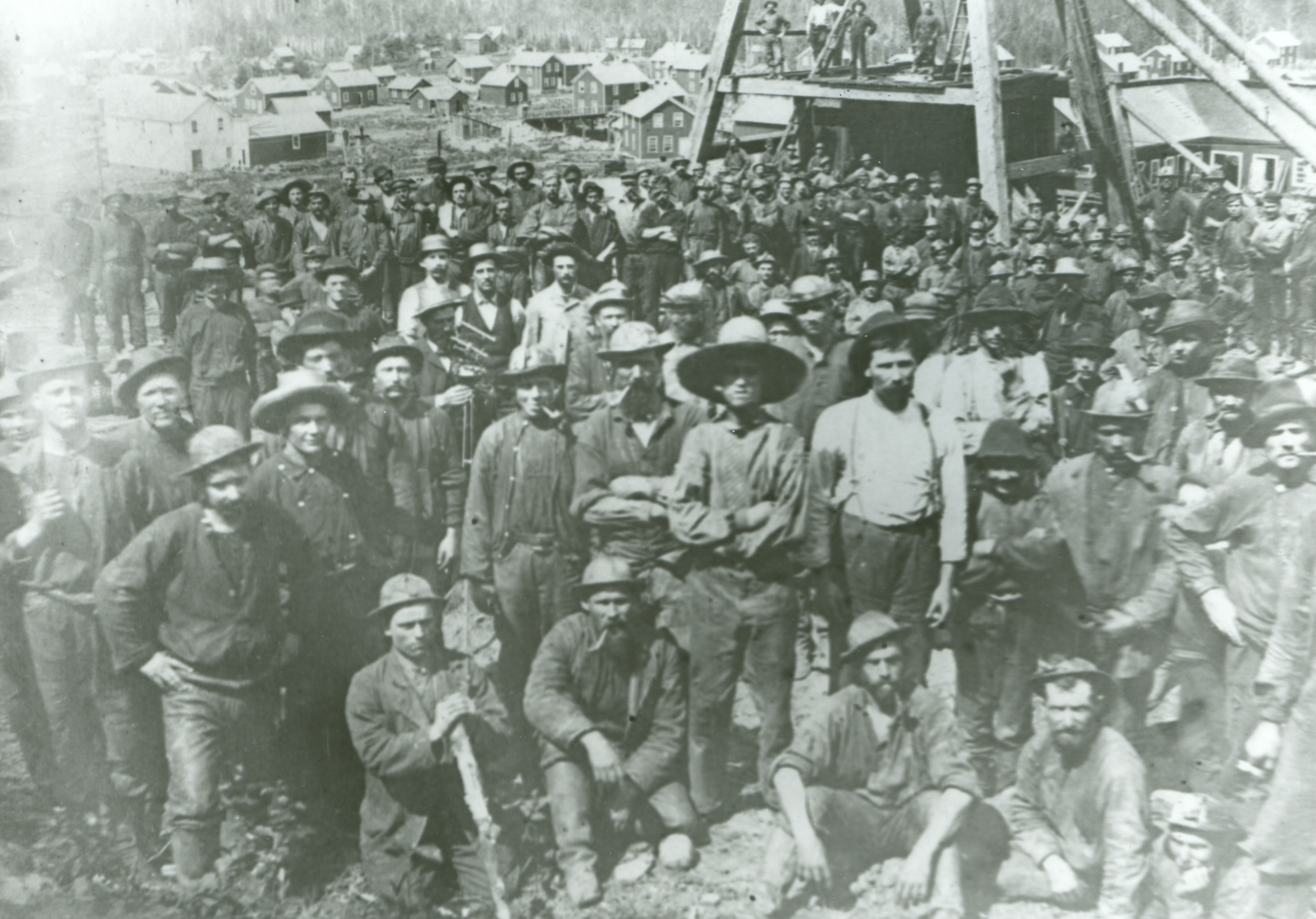 Photograph of miners, circa 1880, with the camera facing west toward Pine Mountain. The company store is at the upper left, with the settlement in the background.